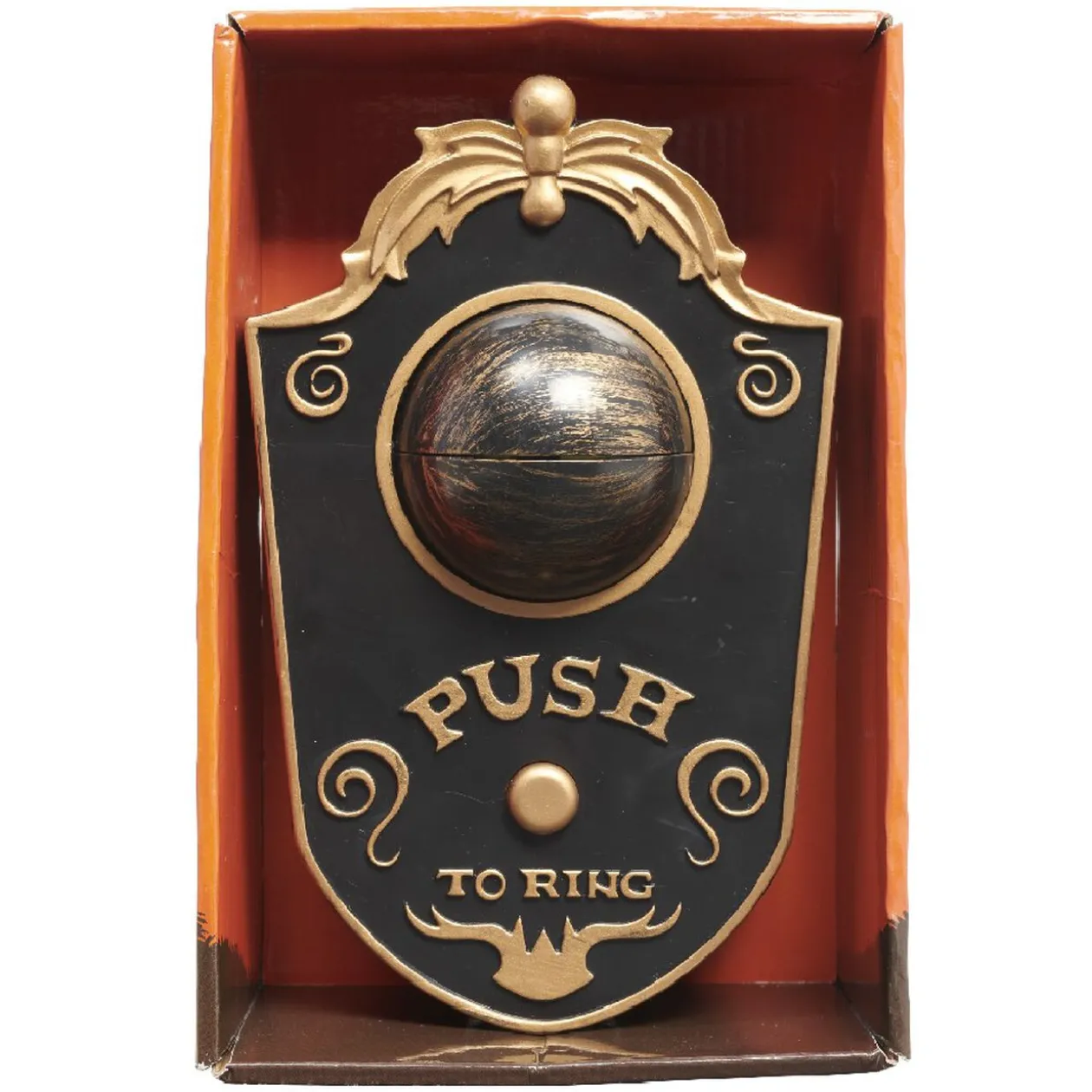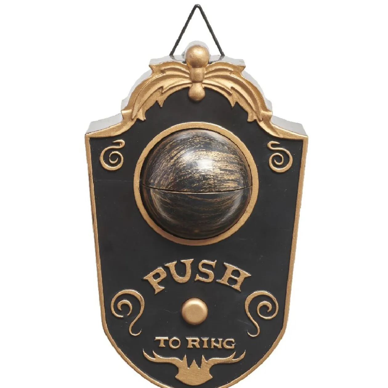 Sonnette noire inscription « Push to ring » avec oeil électrique qui bouge. Idéale pour décorer votre maison le jour d’Halloween et se mettre dans le contexte !