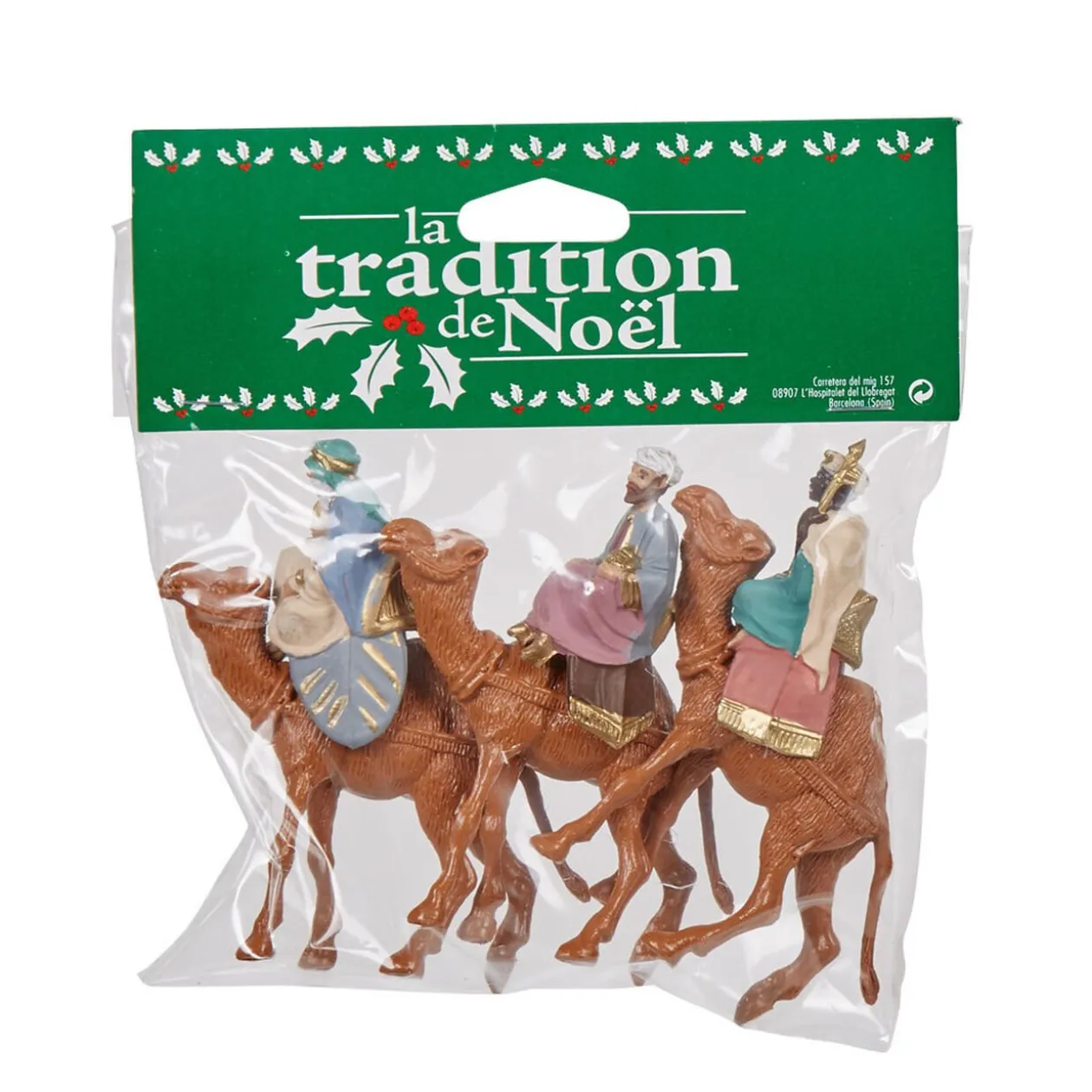 Set de personnages représentant les 3 rois mages montés sur des chameaux, indispensable pour compléter la décoration de votre crèche de Noël.