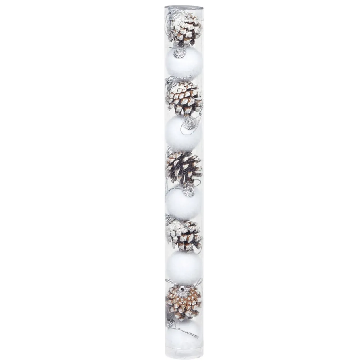 Lot de 10 suspensions de Noël composé de 5 boules blanches et 5 pommes de pin argentées.