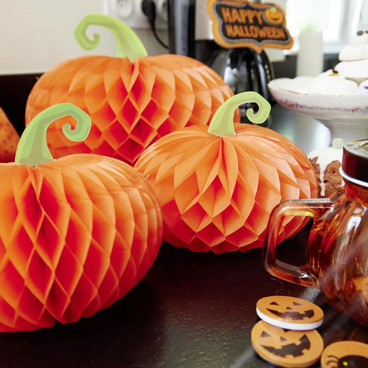 Lot de 3 suspensions papier en forme de citrouille orange et verte. Parfait pour venir agrémenter votre décoration à l’occasion d’Halloween !