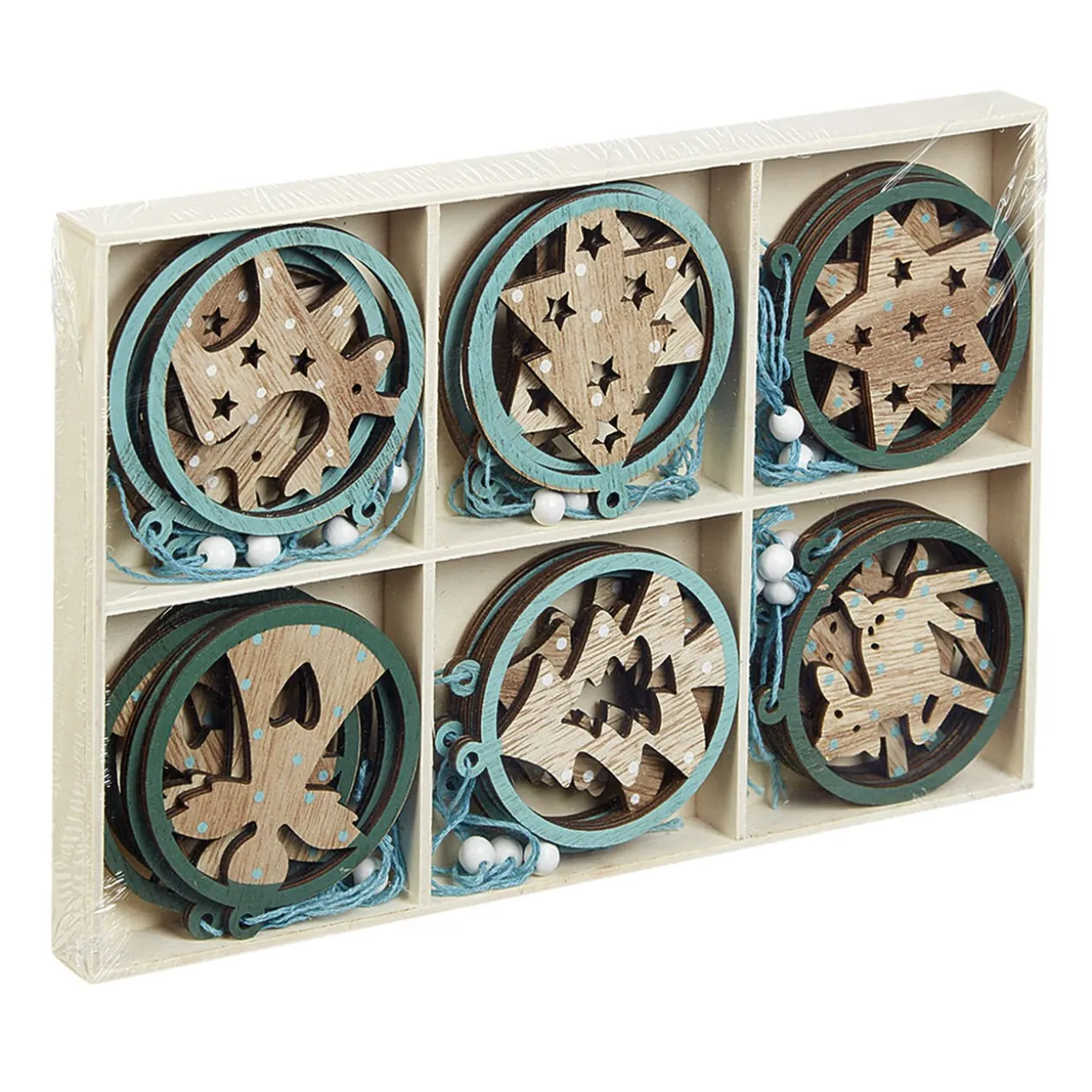 Un peu de verdure, des étoiles, des anges et nos amis les rennes… Optez pour ces suspensions originales en bois vert et naturel pour votre sapin de Noël. Cet assortiment de 24 formes en bois encerclées de vert sera parfait pour créer une décoration de Noël naturelle et chaleureuse.