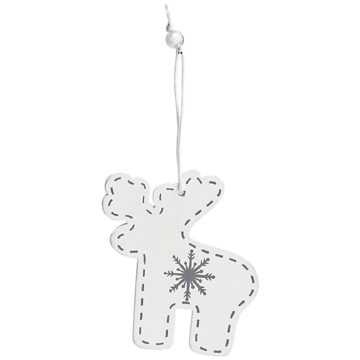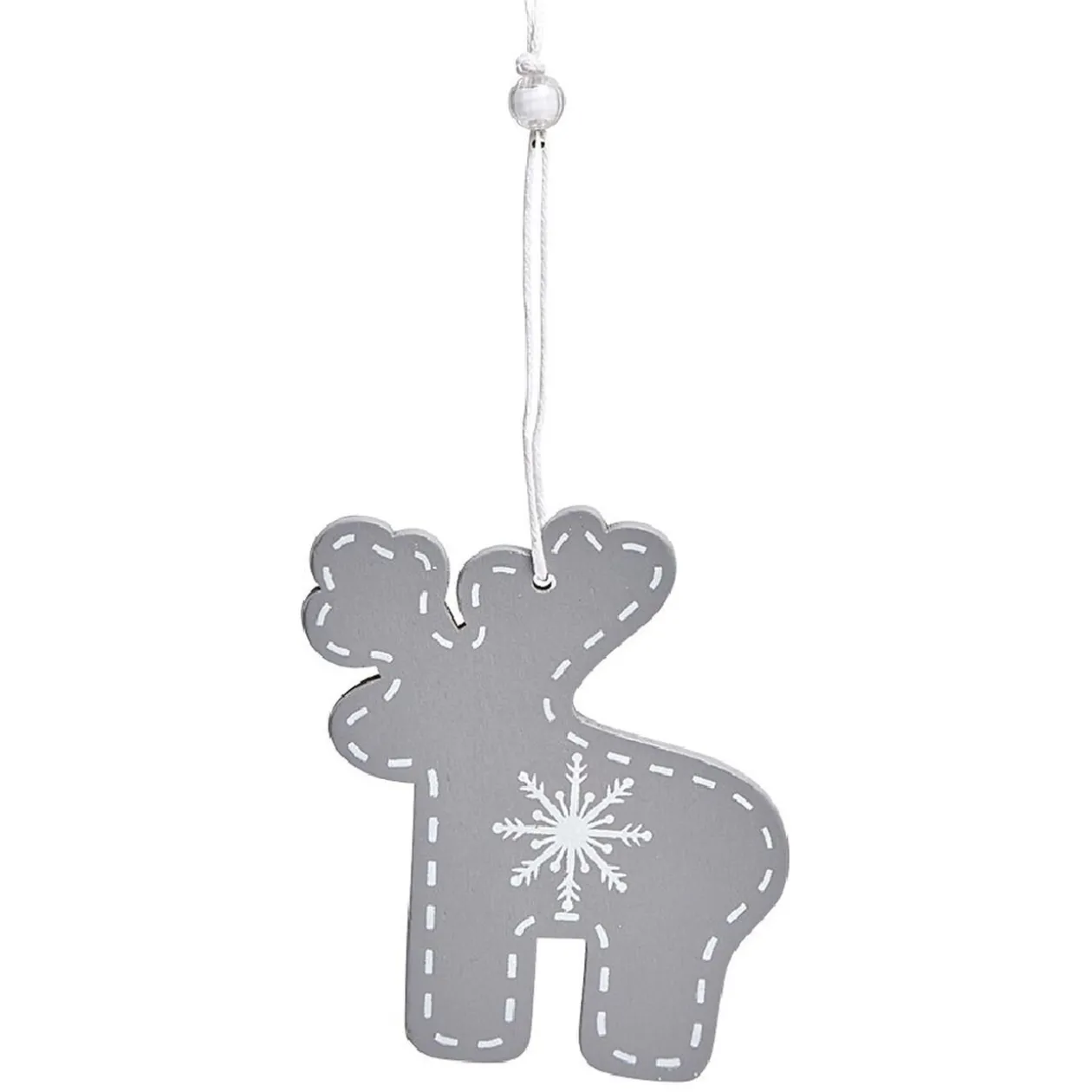 Suspensions de Noël en bois en forme de flocons et rennes gris et blancs.