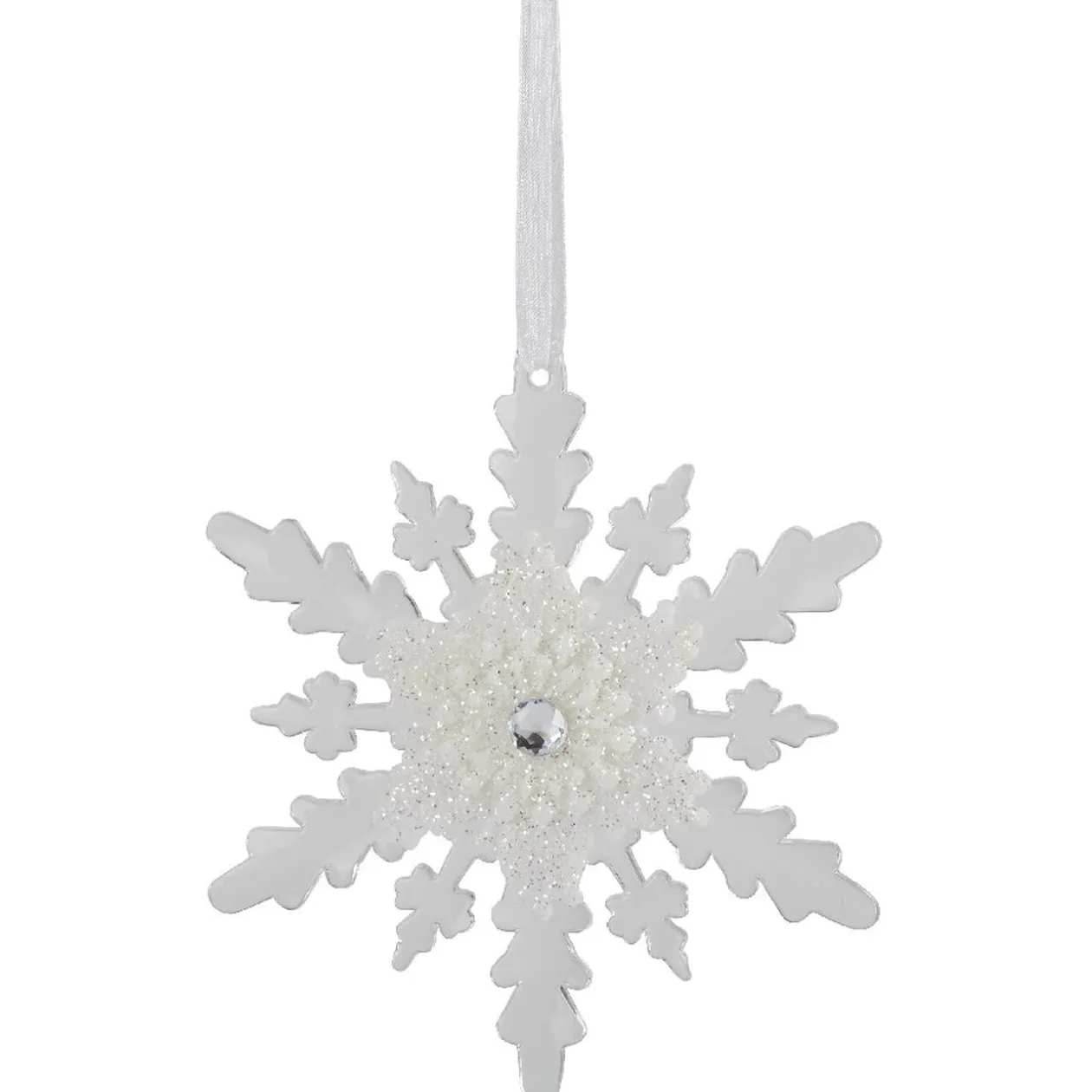 Suspension en forme de flocon blanc transparent, idéal pour apporter une délicate touche de givre à votre sapin de Noël.