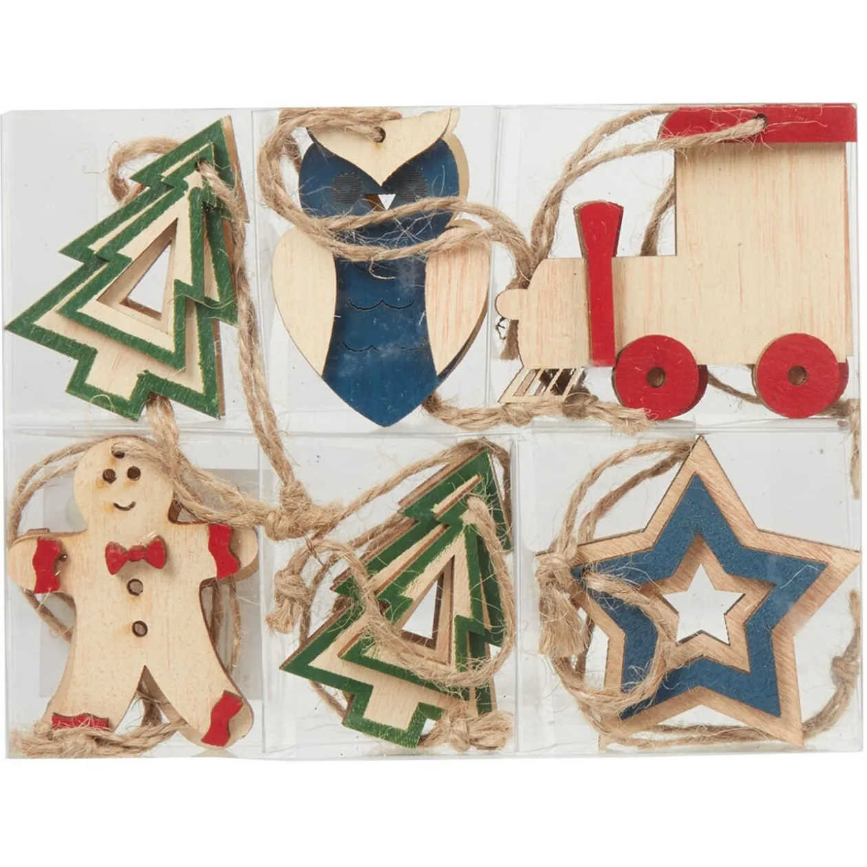 12 décorations de Noël en bois à suspendre : hiboux, sapins, pains d’épices, voitures et étoiles.