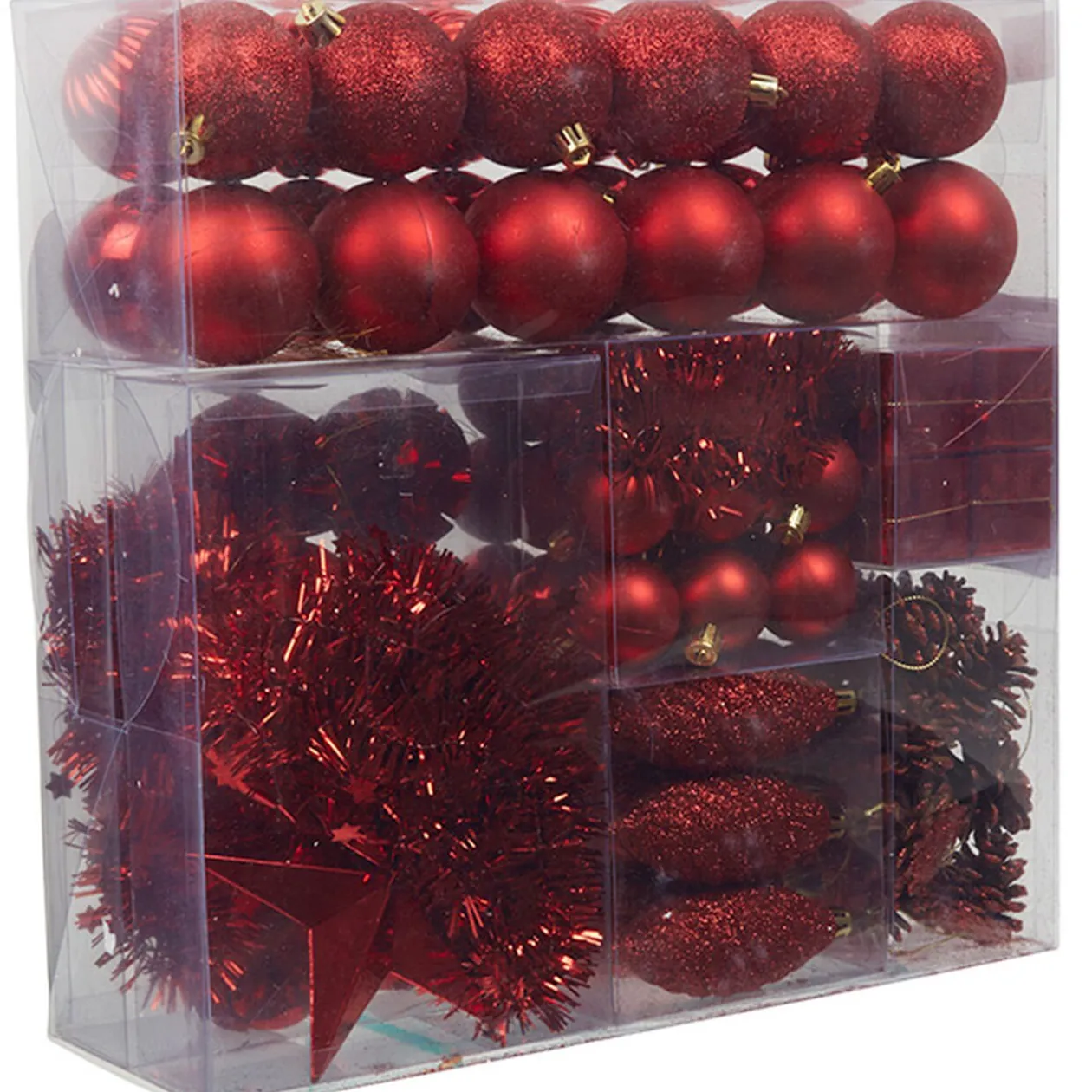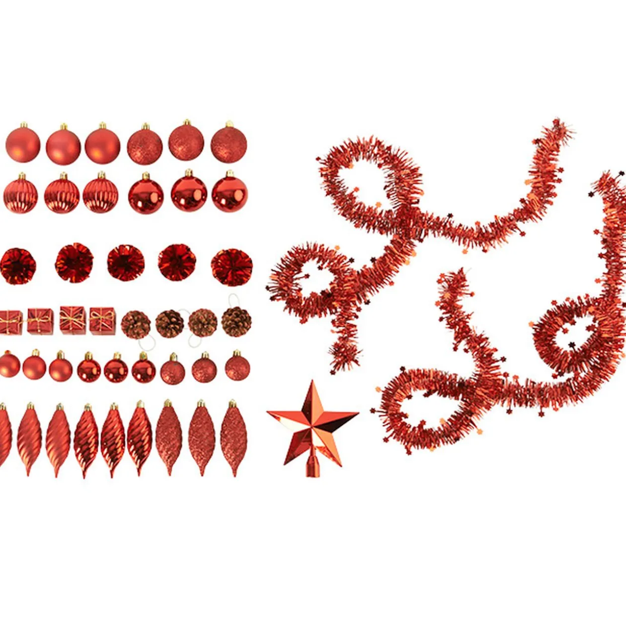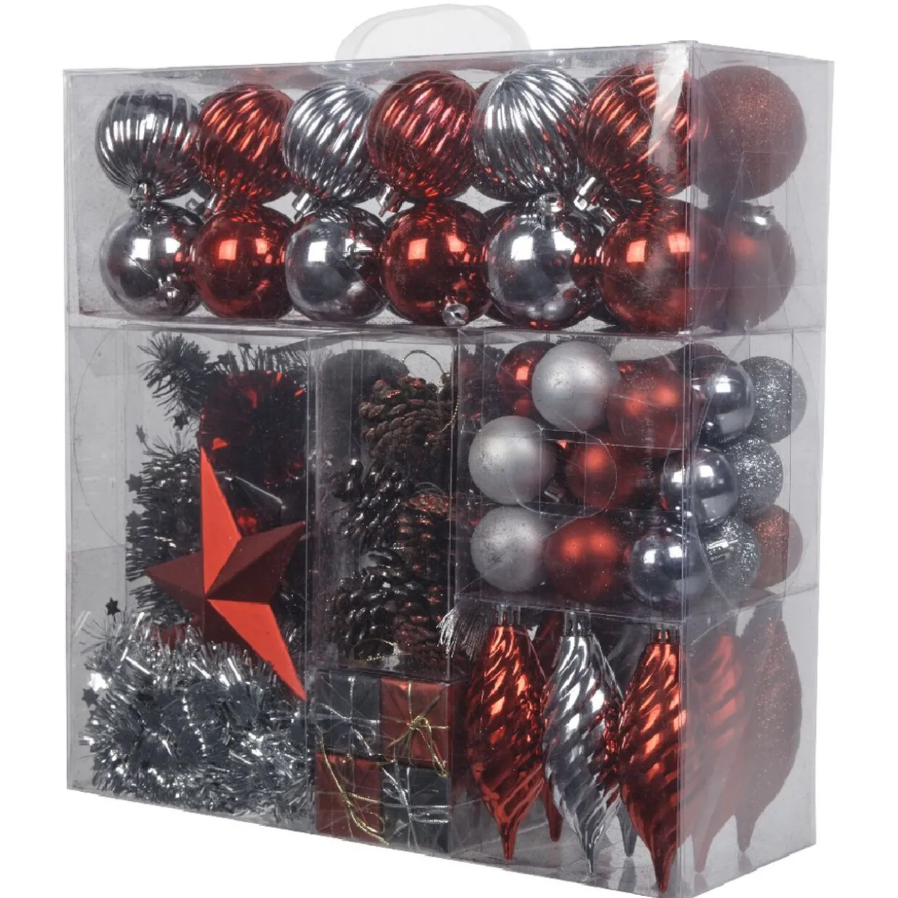 100 suspensions de Noël de couleur rouge et argenté comprenant des boules, toupies, cadeaux, pommes de pin, guirlandes …).