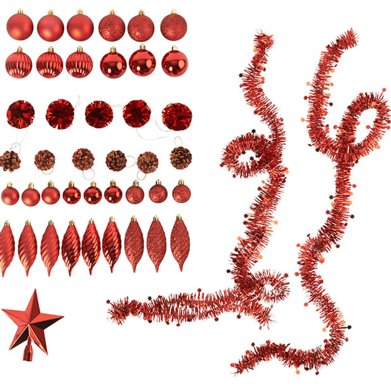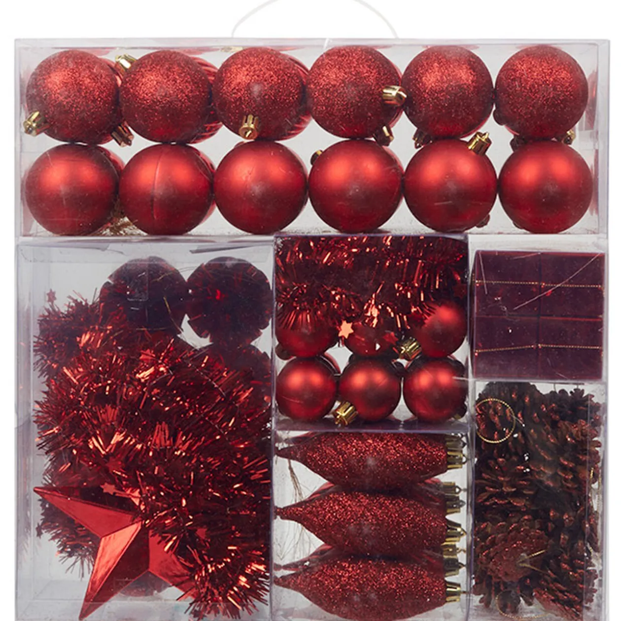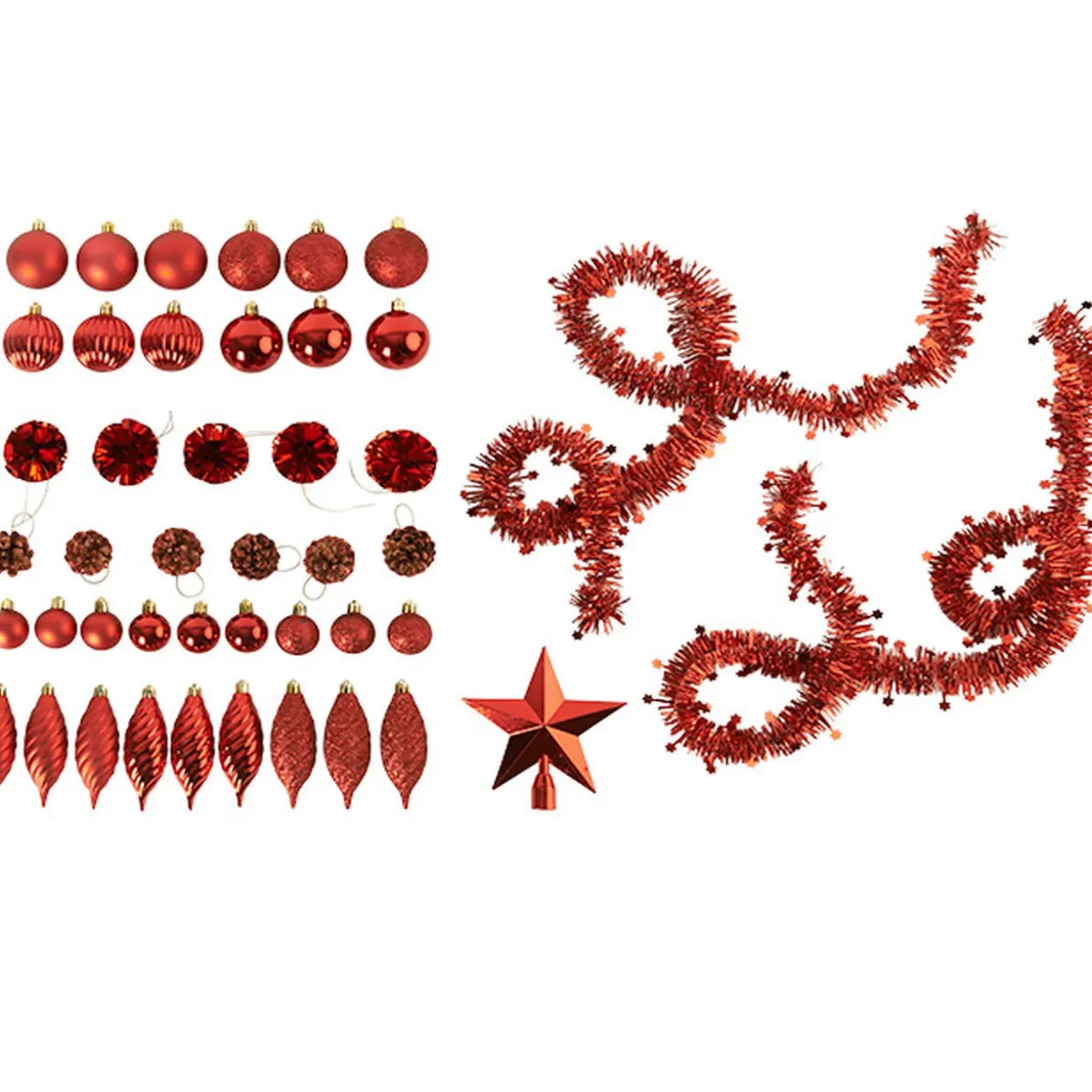 100 suspensions de Noël de couleur rouge et argenté comprenant des boules, toupies, cadeaux, pommes de pin, guirlandes …).