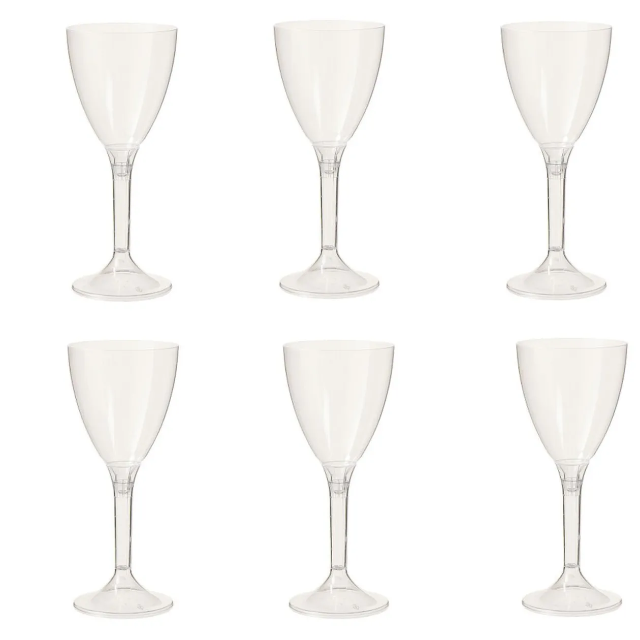 Lot de 6 verres à pied transparents en plastique réutilisable.