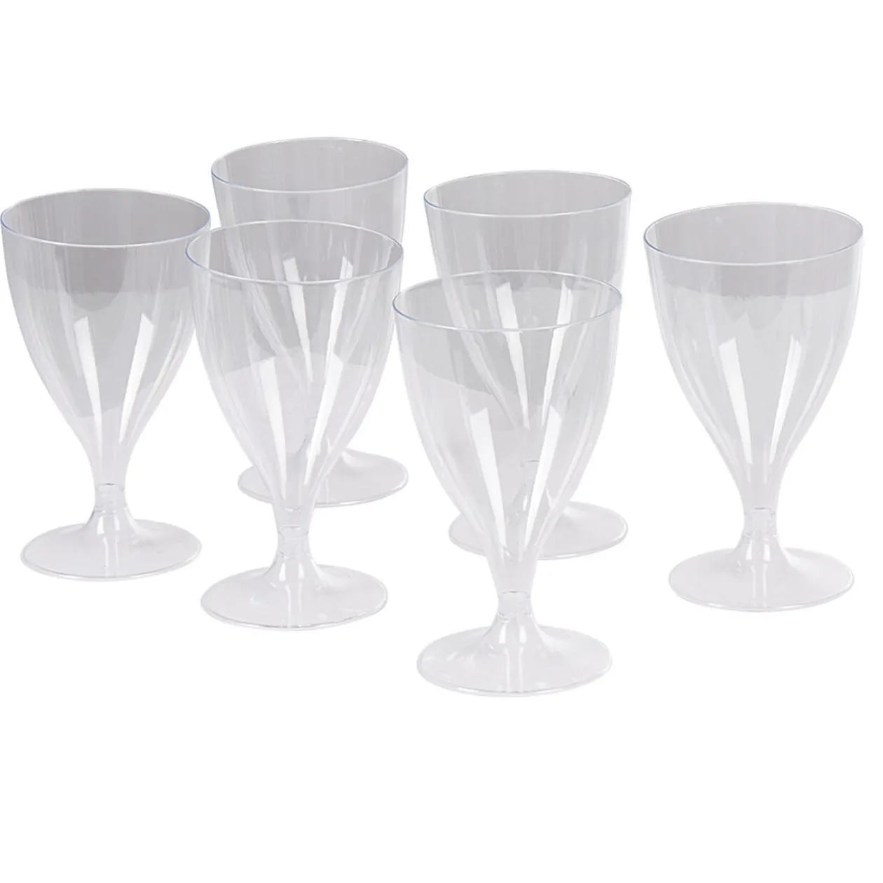 Lot de 6 verres bas à pied en plastique transparent, pour passer une bonne soirée sans casse ni vaisselle.