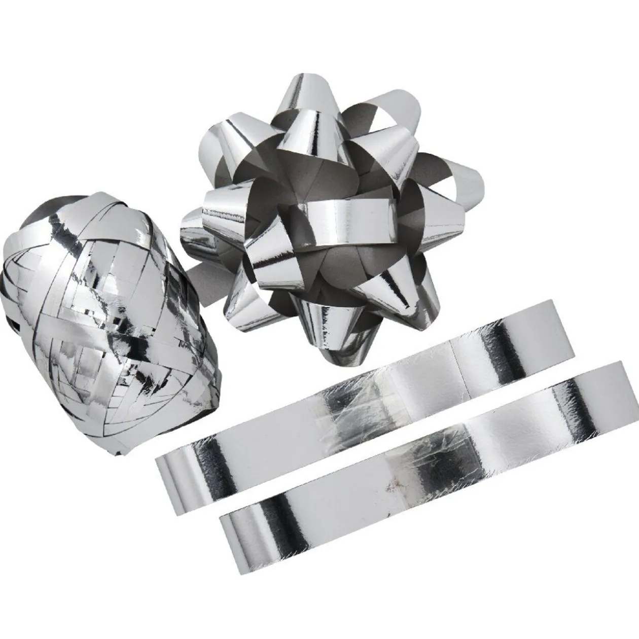Bobine de bolduc argenté de 10 m de longueur et 5 mm de largeur, noeud et 2 rubans argentés inclus, plastique.