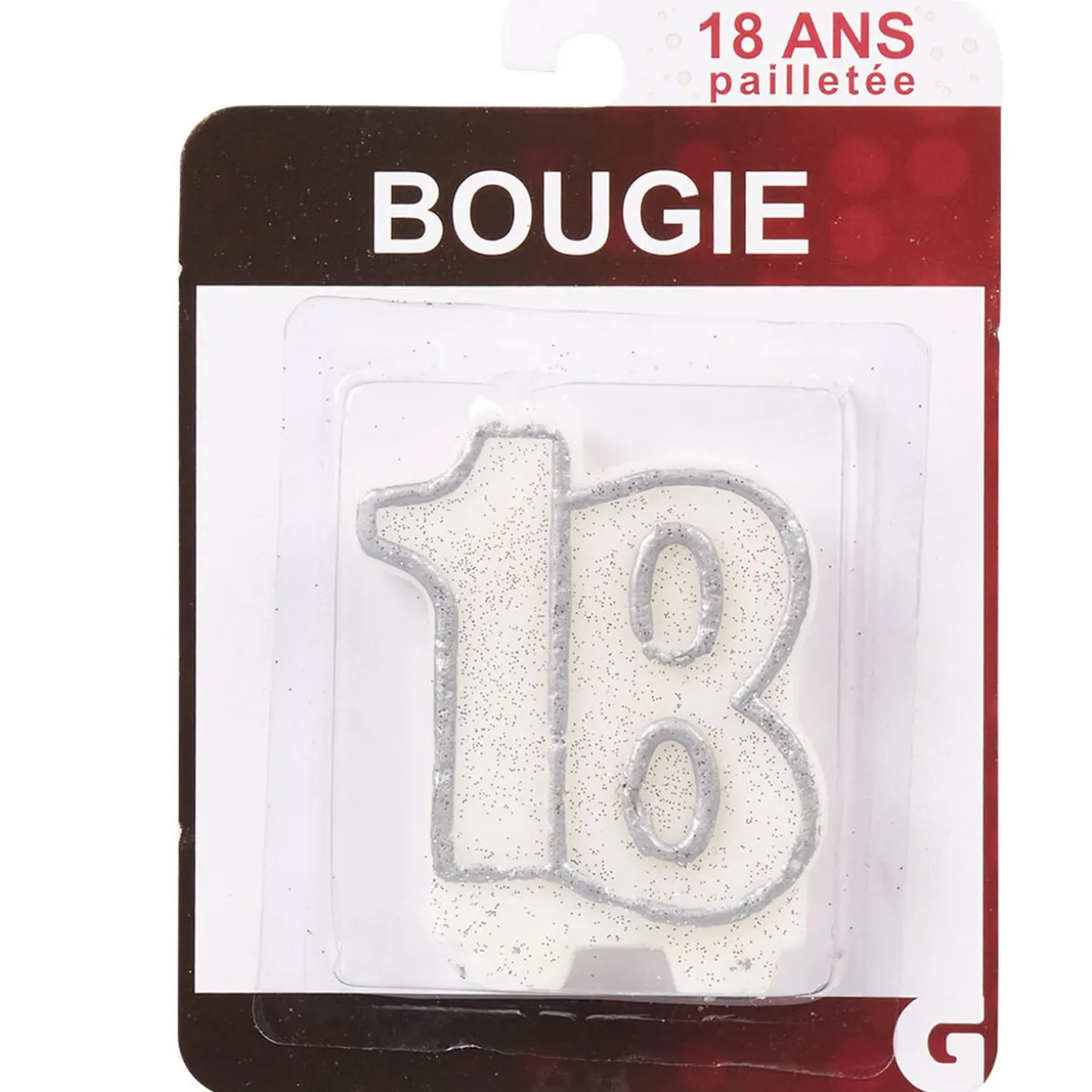 Bougie anniversaire pailletée chiffre 18, dim. 6xh.7 cm, paraffine.