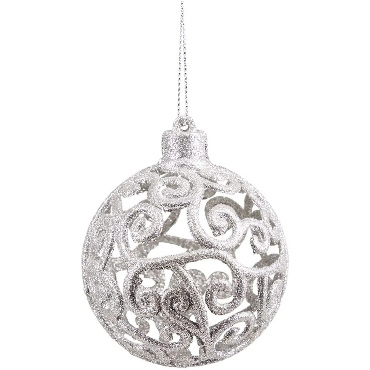 Lot de 3 boules de Noël pailletées argentées à motif arabesque, idéales pour apporter une touche chic à votre décoration ou votre sapin.