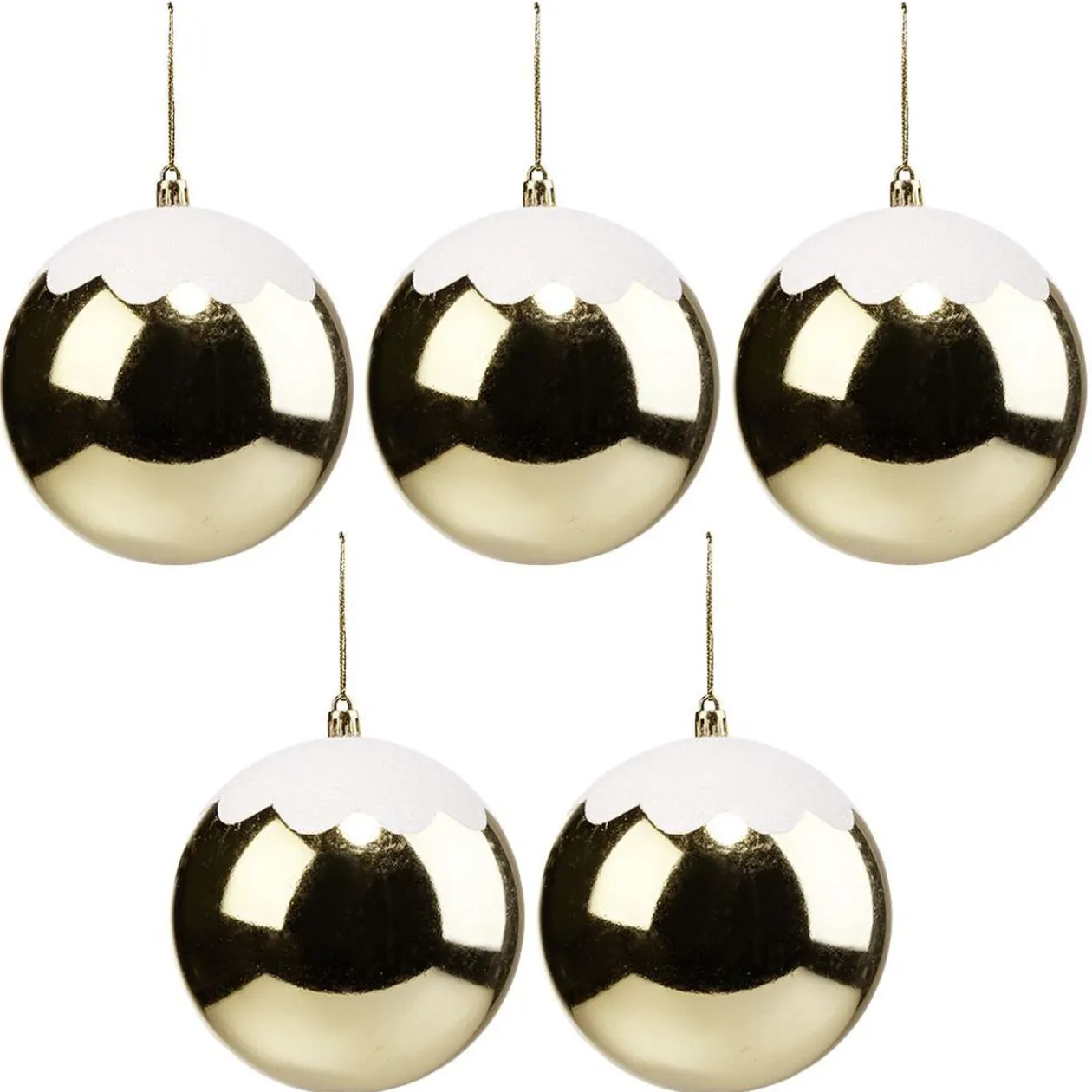 Lot de 5 boules de Noël XL dorées avec effet neige pailletée sur le dessus,à suspendre au sapin pour un rendu des plus chic et festif.