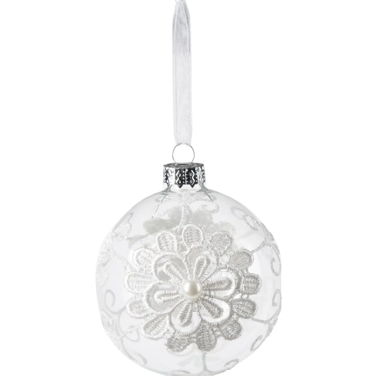 Boule de noël transparente d’un diamètre de 8 cm décorée de dentelle blanche.