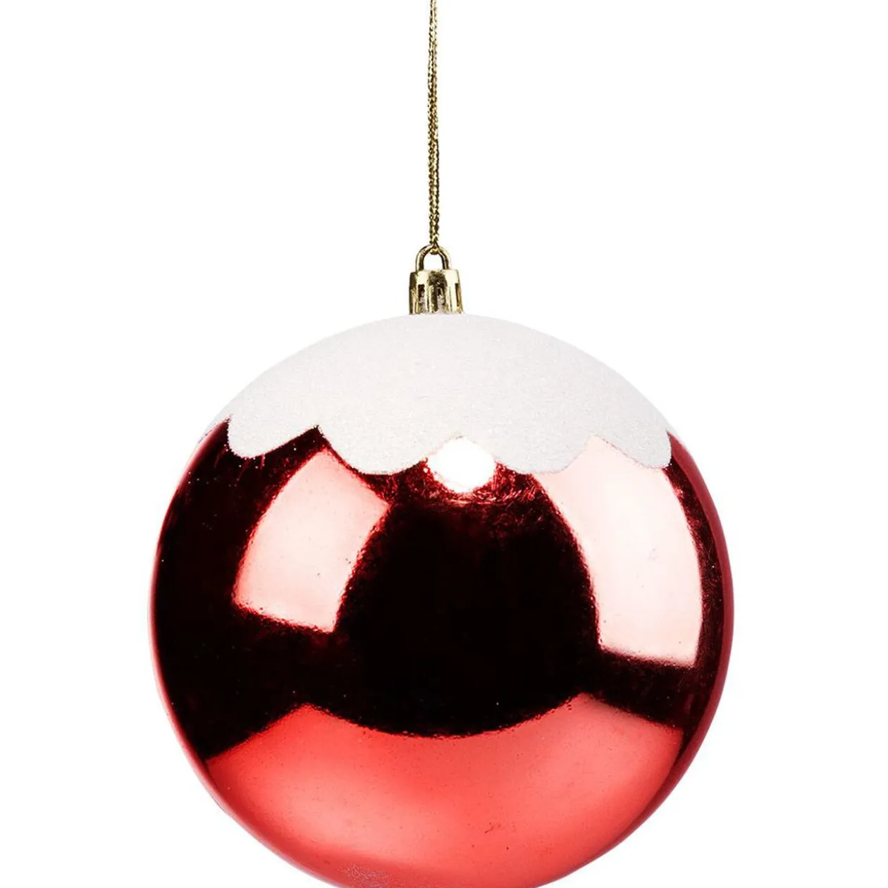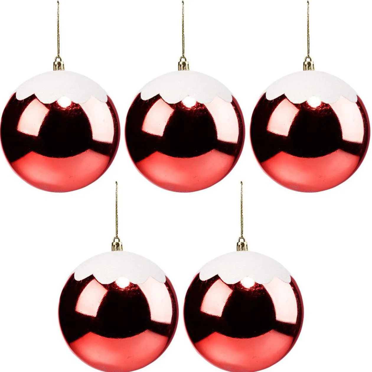 Lot de 5 boules de Noël XL rouges avec effet neige pailletée sur le dessus,à suspendre au sapin pour un rendu des plus chic et festif.
