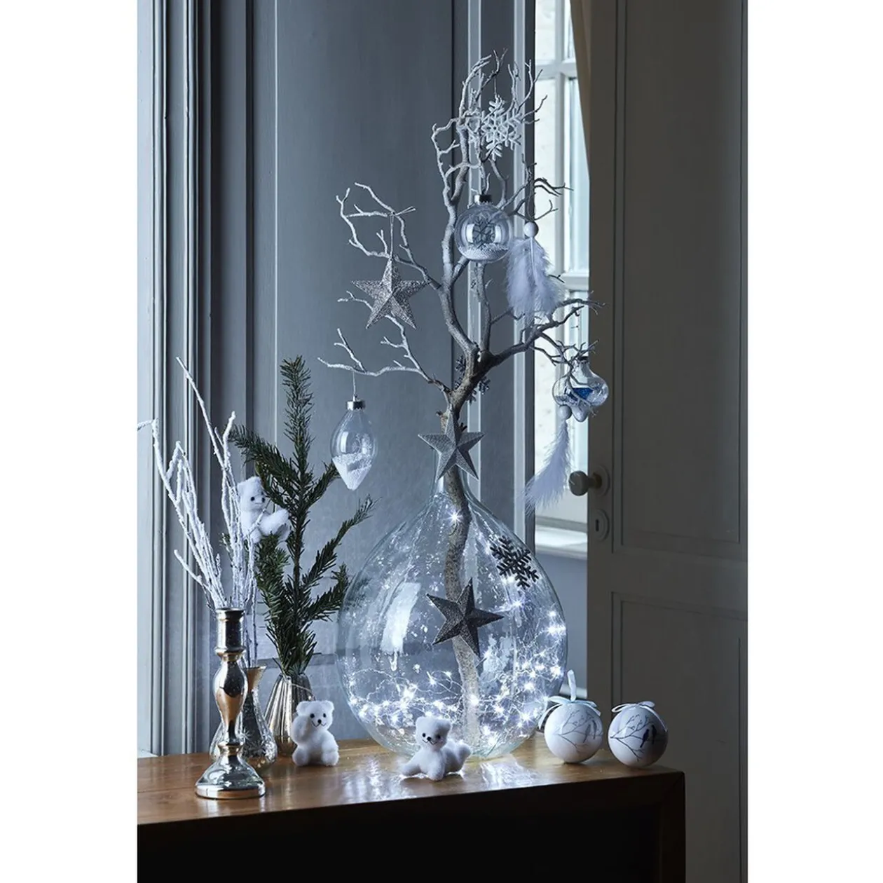 Boule de Noël à suspendre transparente avec neige artificielle à l’intérieur.