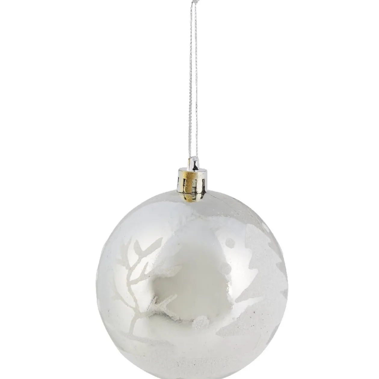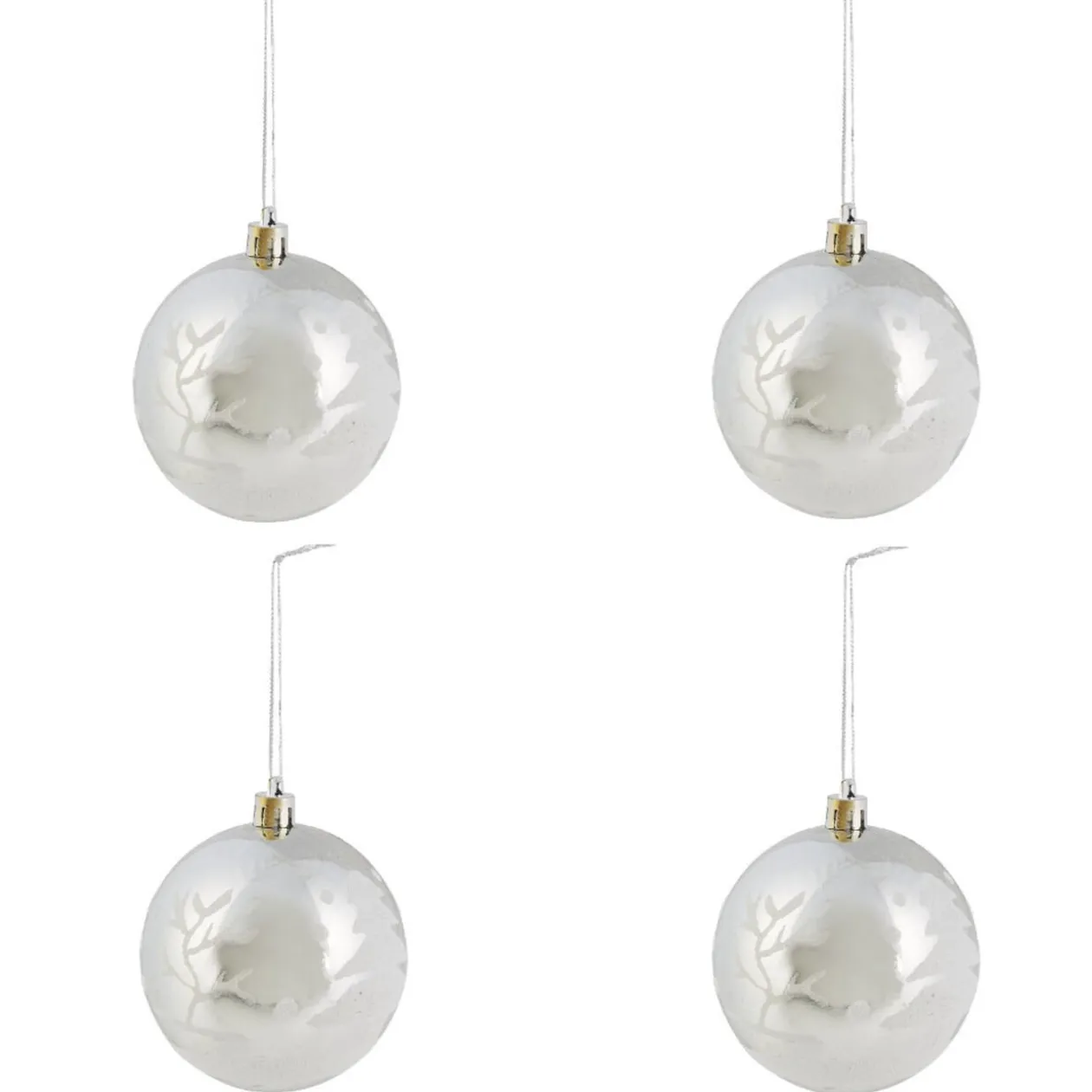 Ce lot de 4 boules argentées à motif sapin et arbre à l’effet sucré sera idéal pour faire briller votre sapin.