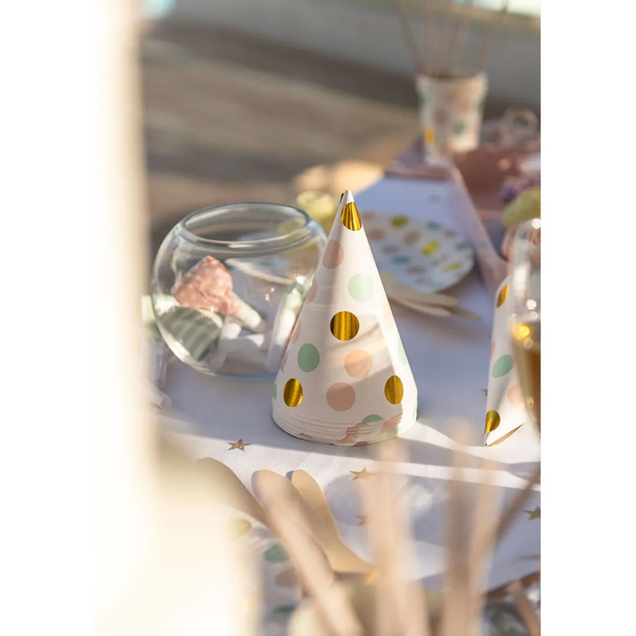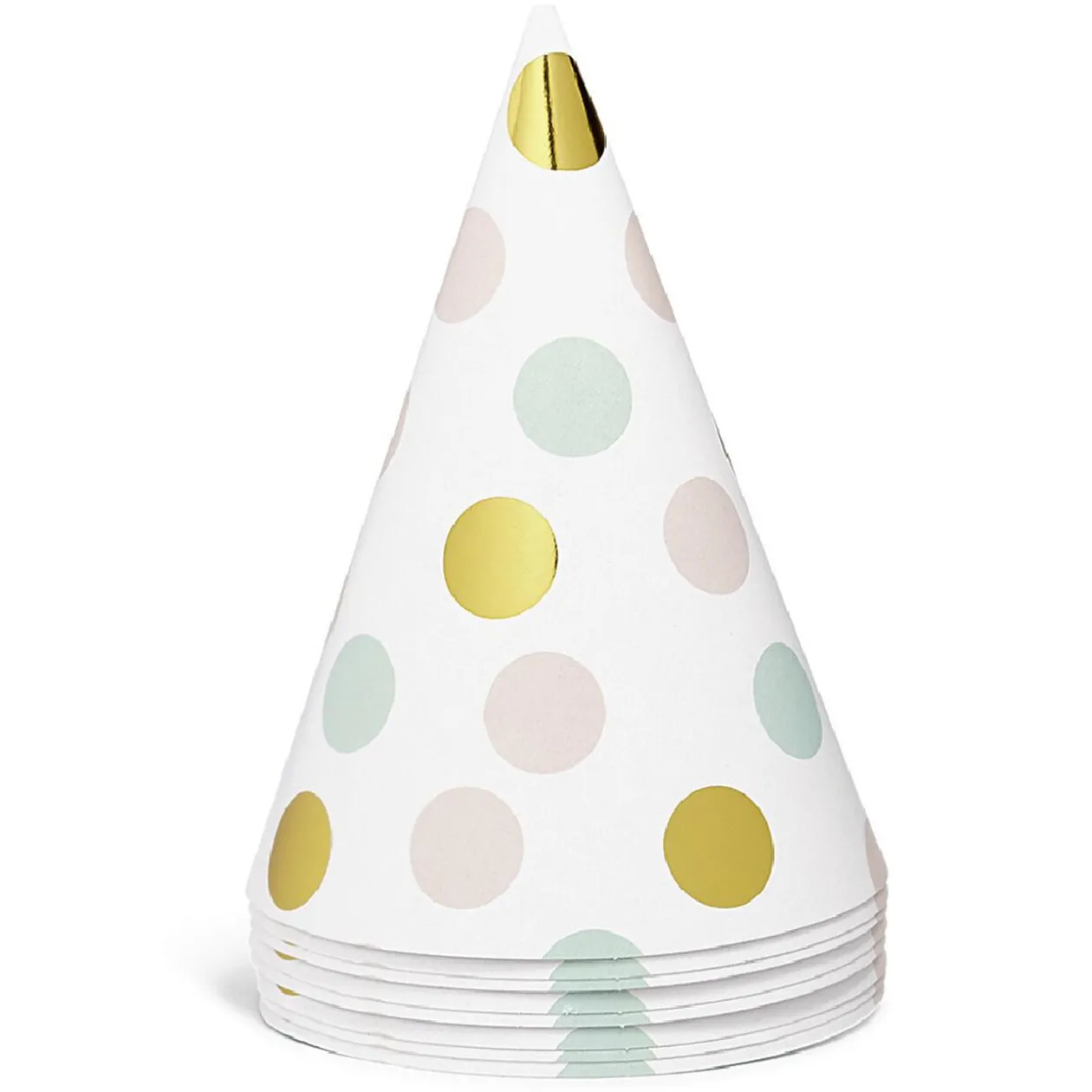 Ornez vos têtes de ces chapeaux de fête blanc à poids roses, verts et dorés et en avant la musique !