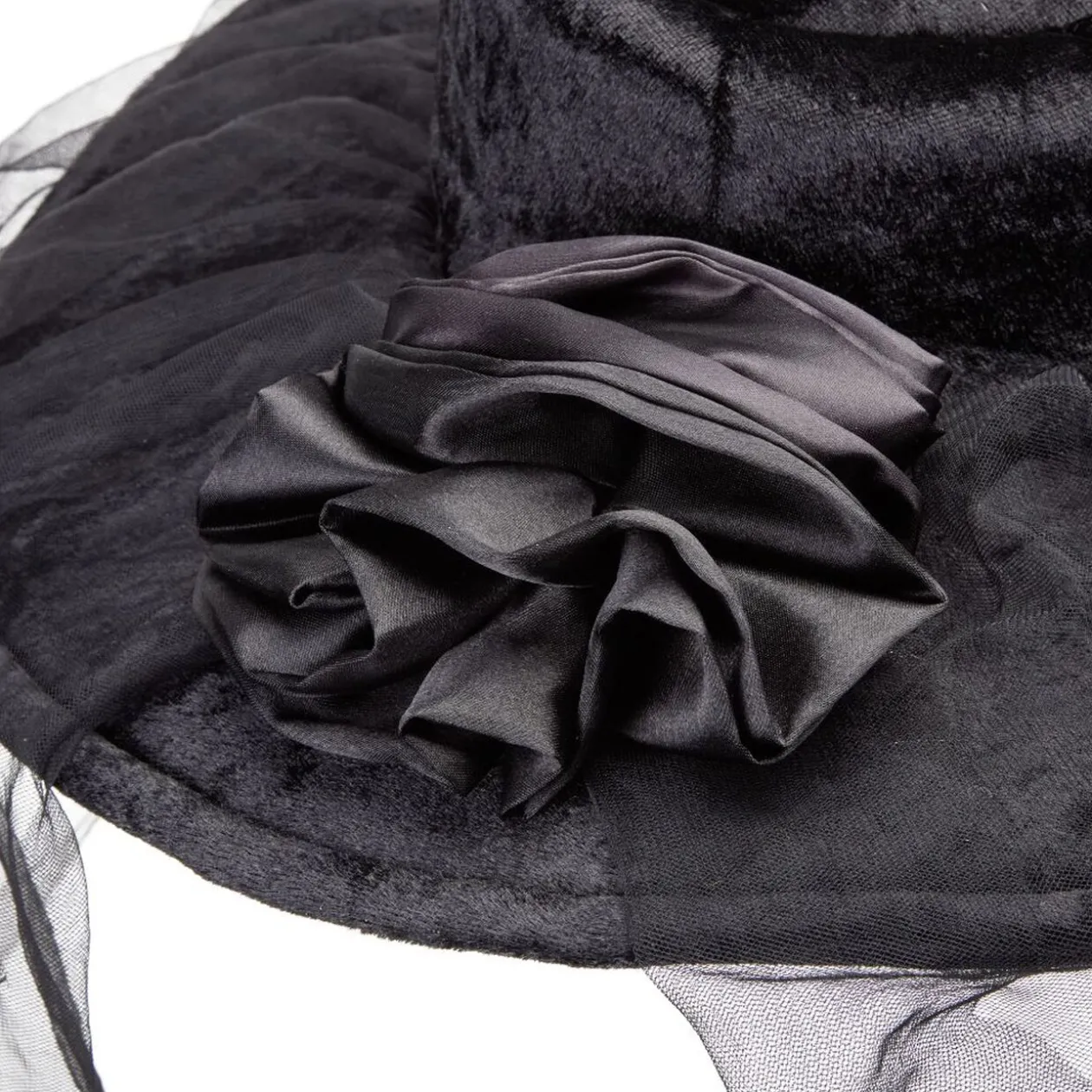 Chapeau fantaisie noir avec voile et araignée, idéal pour compléter un déguisement d’Halloween !