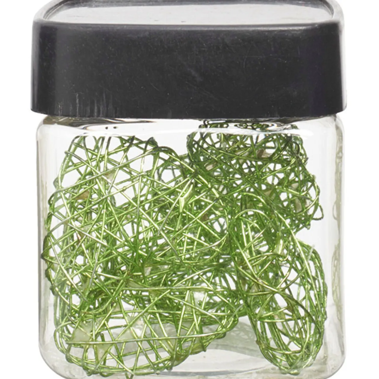 7 coeurs verts anis, L. 4 cm, métal. Peut s’utiliser en décoration pour mariage ou autre évènement.