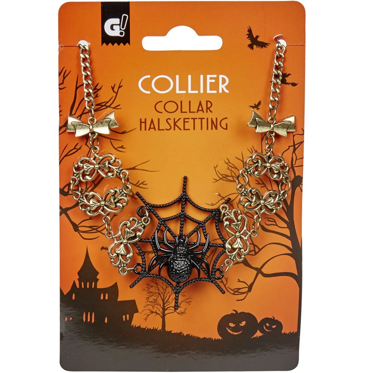Complète ton costume de reine des araignées ou de sorcière maléfique avec ce collier doré et son araignée noire sur sa toile pour être vraiment la plus macabre.