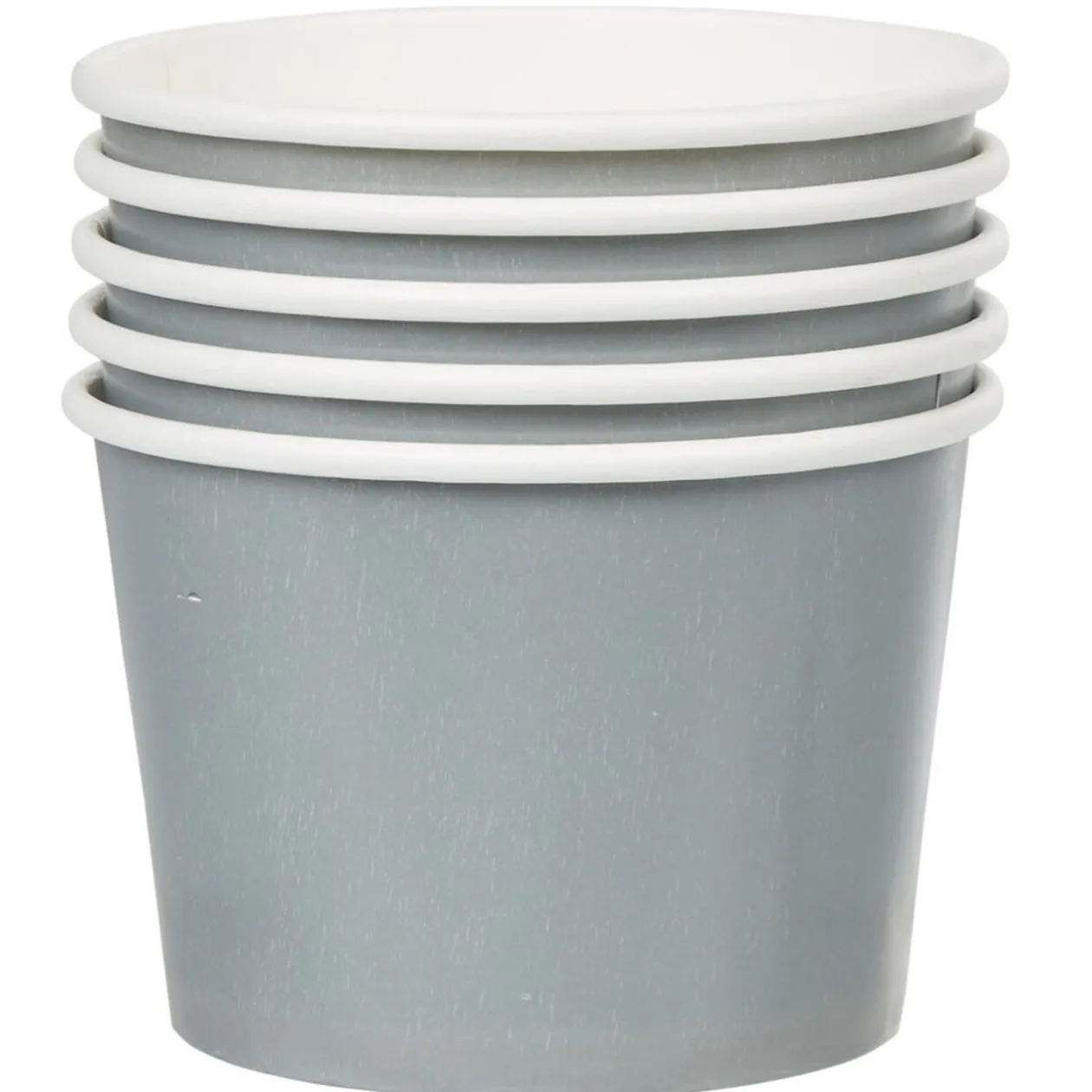 5 coupelles apéritif en carton de couleur grise et blanche.