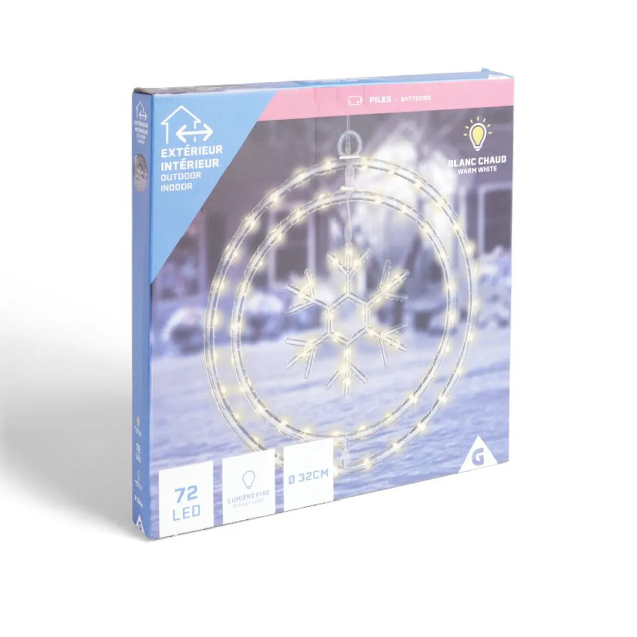Couronne lumineuse avec flocon de neige, équipée de 72 LEDs à éclairage fixe blanc chaud.
