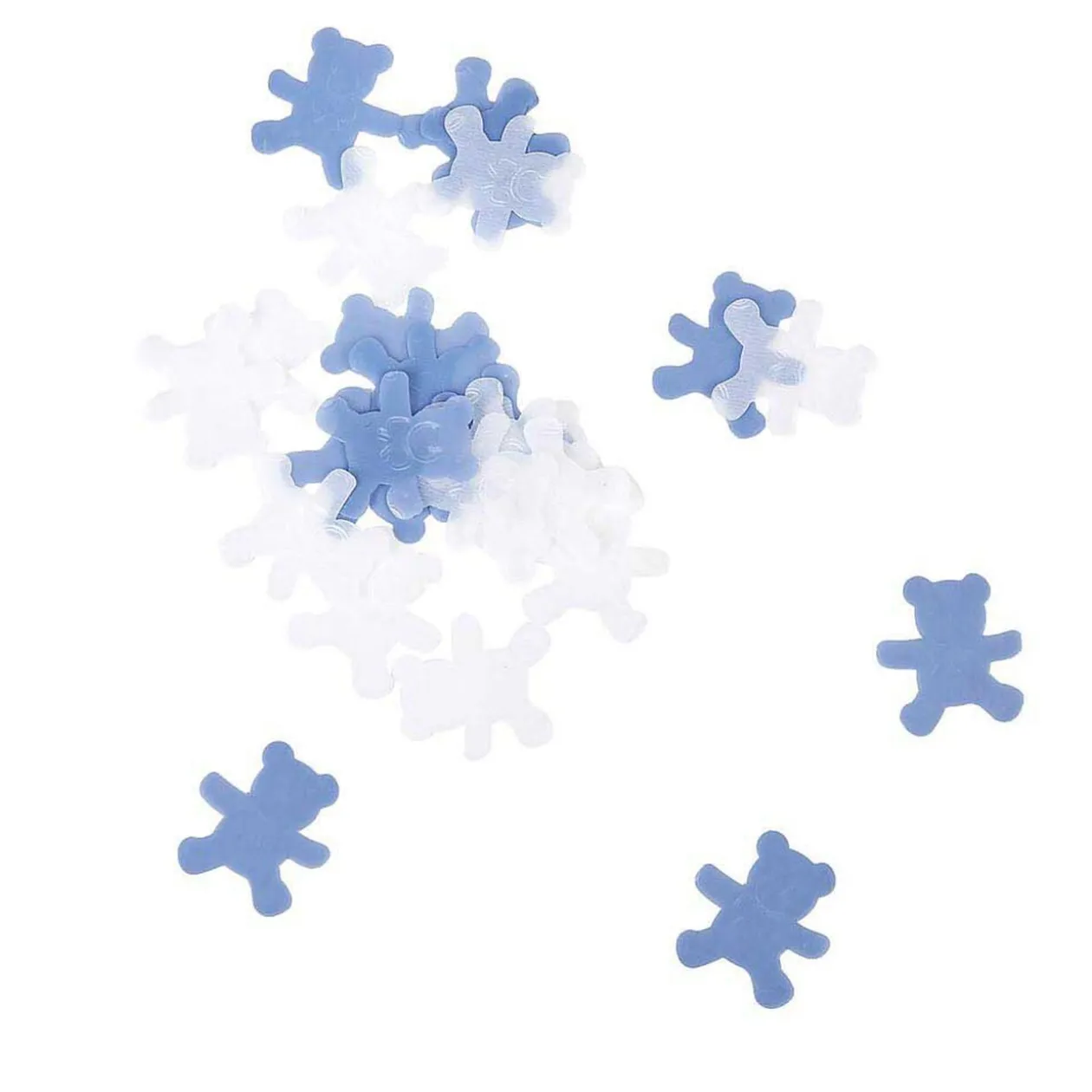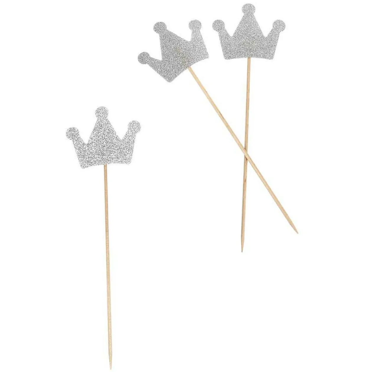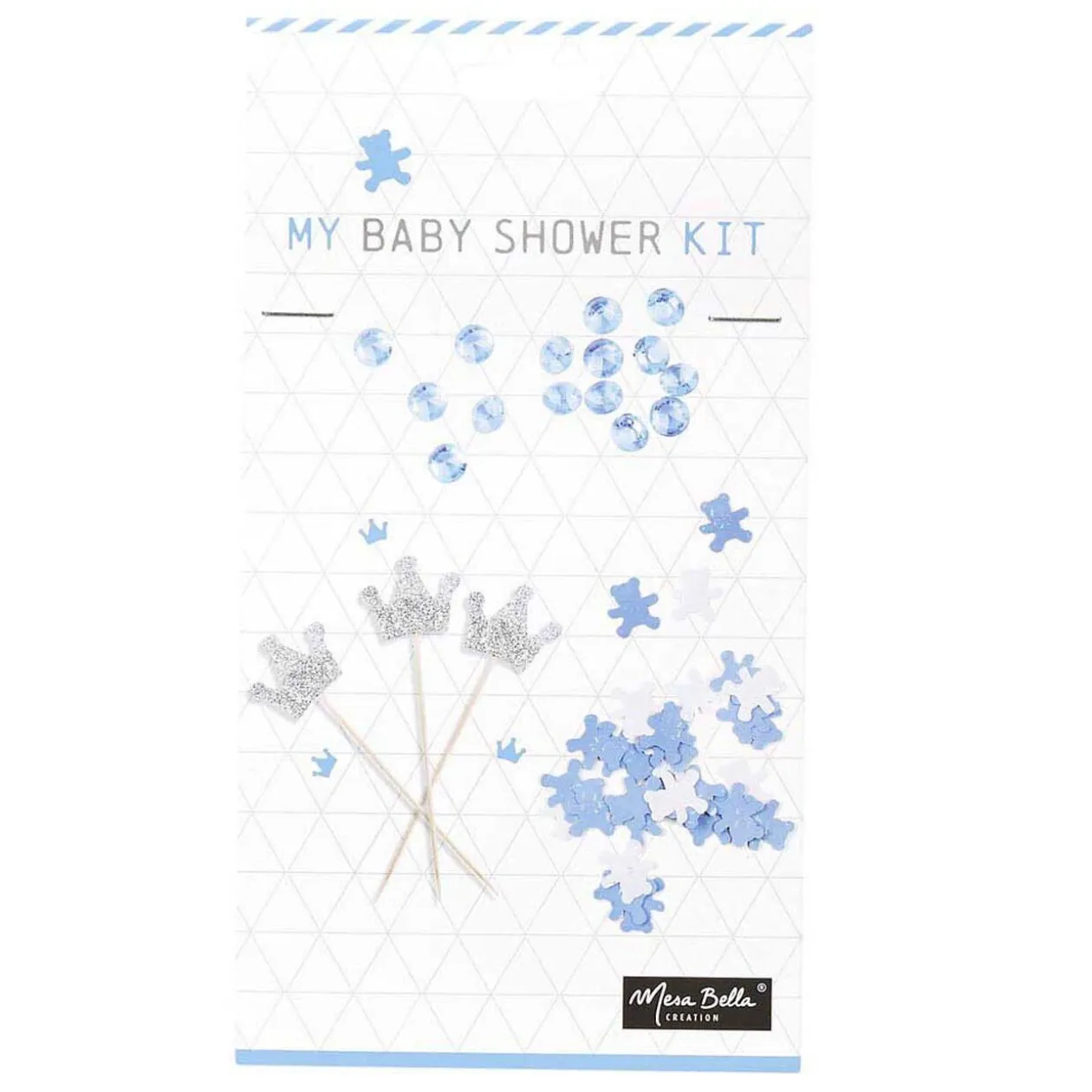 Comprend 6 piques couronne de couleur argenté L. 17 cm, une cinquantaine de minis diamants bleus ø 5 mm et des minis oursons bleus et blancs dim. 2×2 cm.
