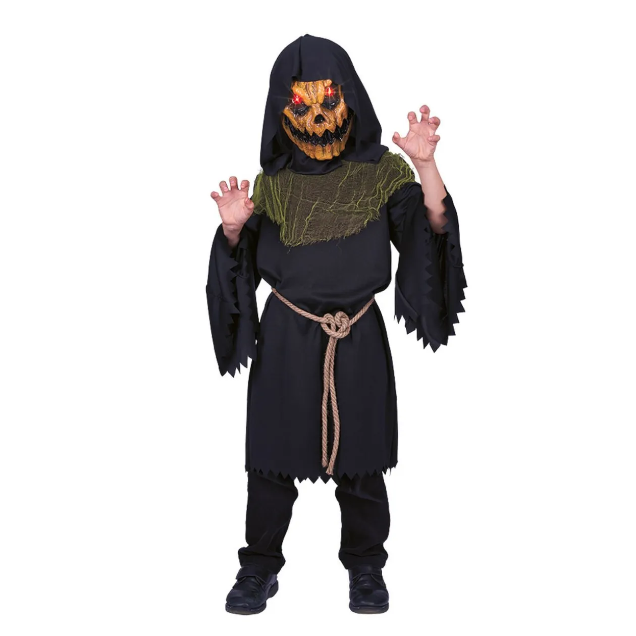 Un déguisement de citrouille démoniaque lumineux et sonore pour enfant de 11/14 ans. Comporte un masque, une capuche et une tunique.