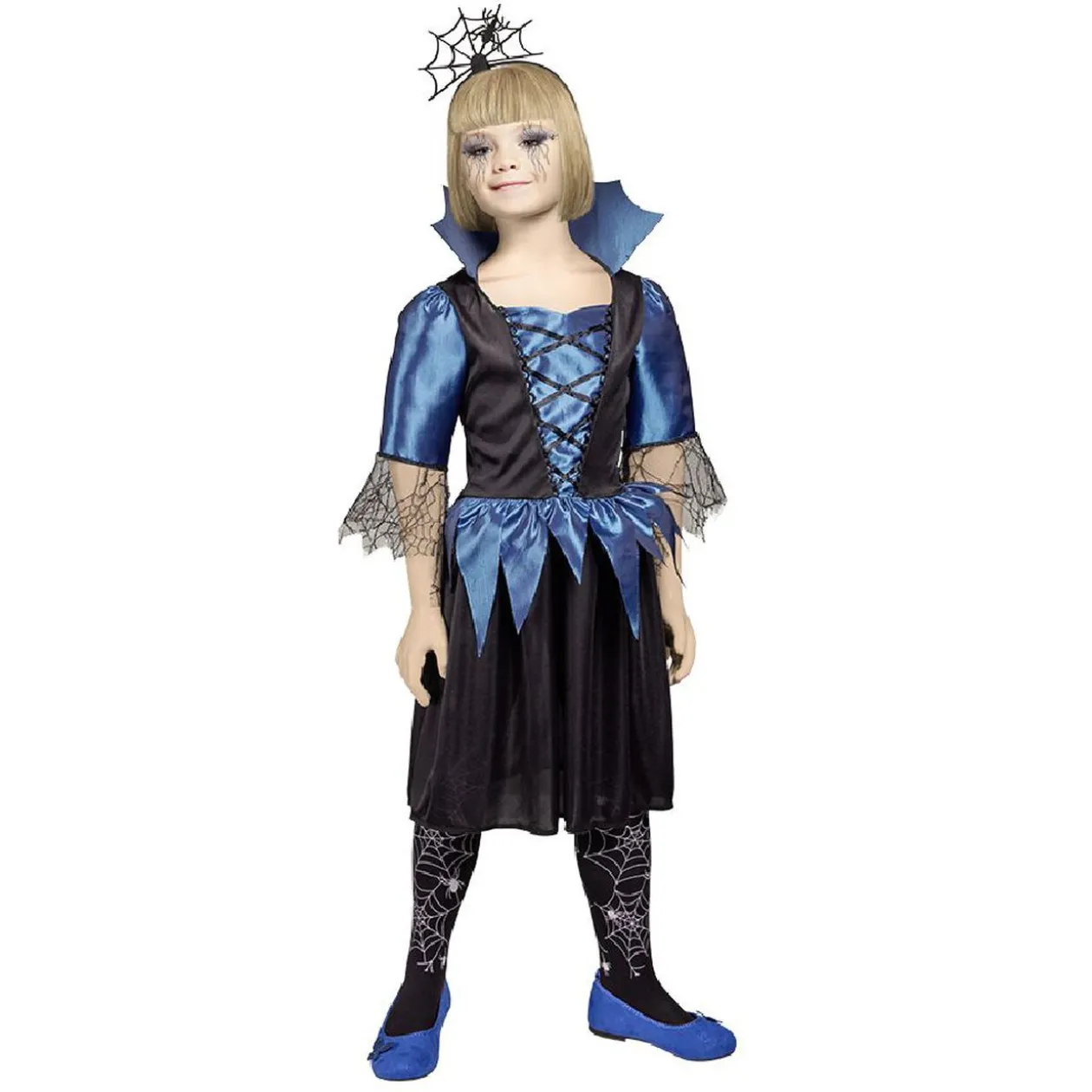 Déguisement de vampire pour enfant composé d’une robe noire et bleue à dentelle et d’un serre-tête assorti, parfait à l’occasion d’Halloween !