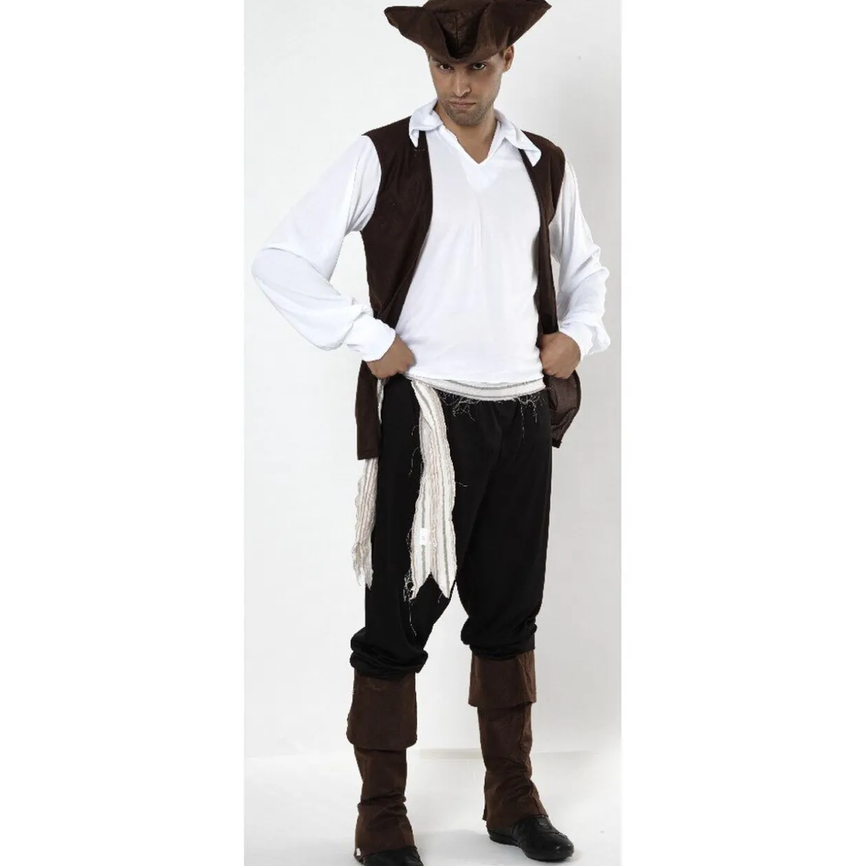 Déguisement adulte pirate comprenant 1 tunique, 1 chapeau, 1 ceinture et des sur-bottes, polyester et plastique.