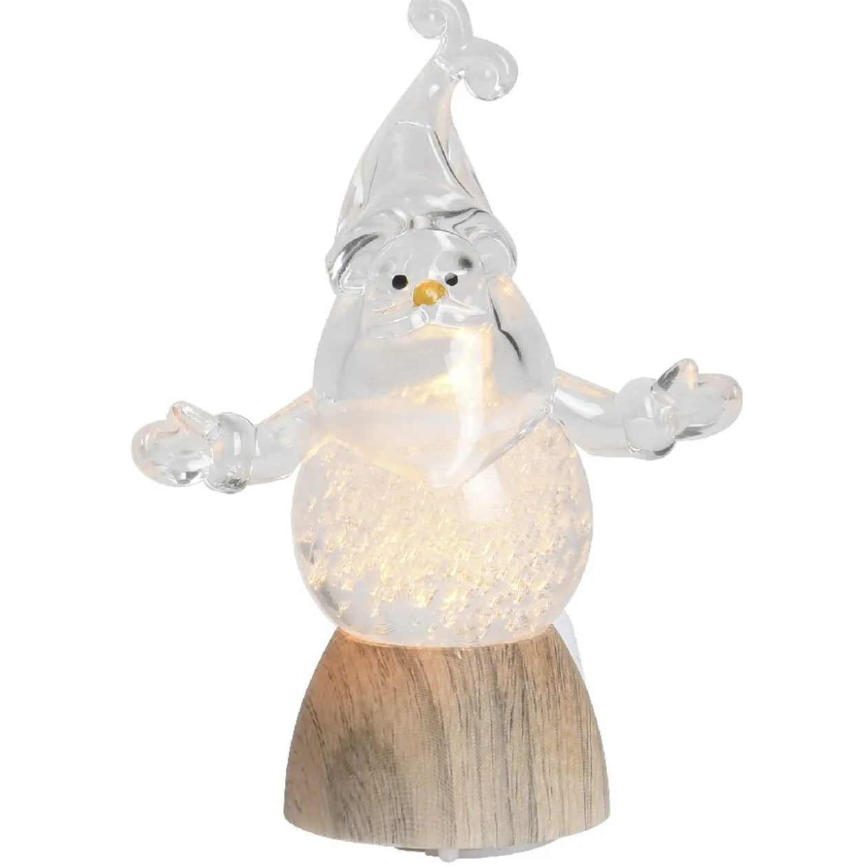 Complétez votre décoration de Noël avec cette figurine en plastique de couleur transparente. Elle est dotée d’une lampe LED qui diffusera une lumière chaude dans votre intérieur. Cette figurine existe en 4 modèles, tous dans le thème de Noël. Sa base en bois est stable, vous pourrez la poser en toute sécurité, sur la table ou au pied du sapin. Ce produit fonctionne avec une pile incluse.