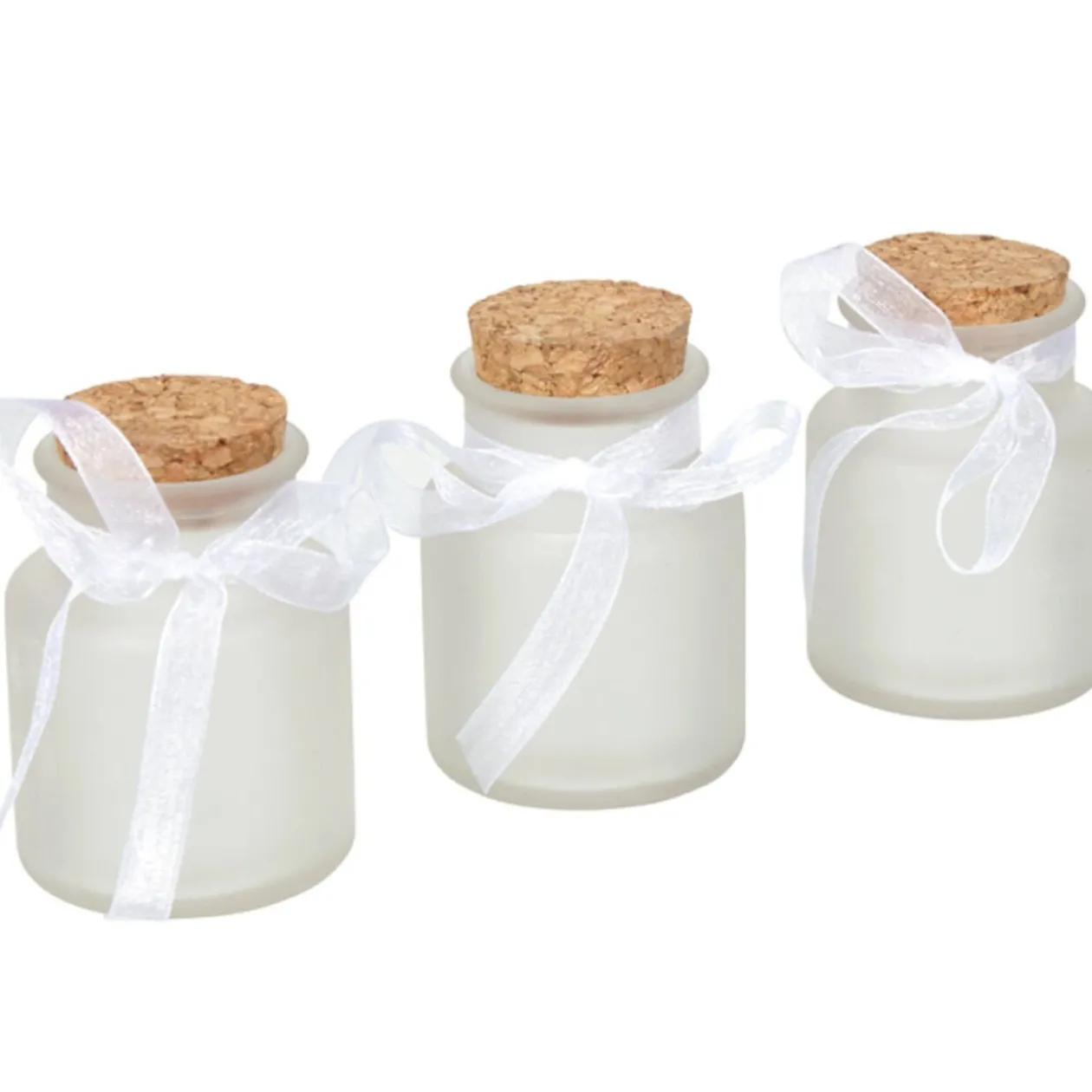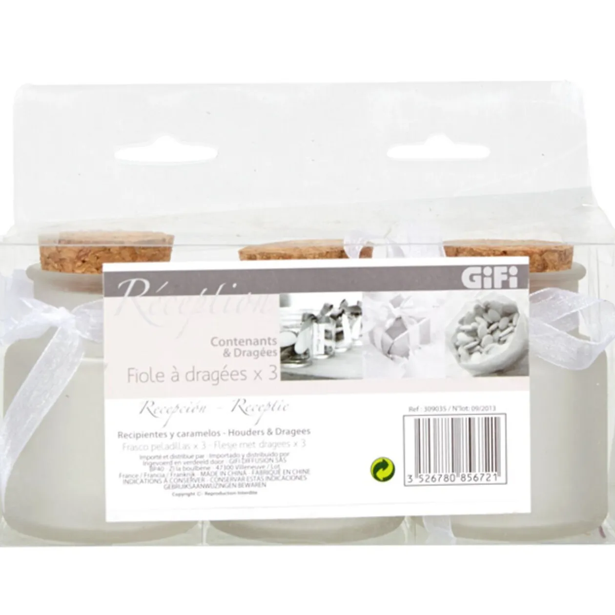 3 fioles à dragées, h. 7,8 cm, ø 5,5 cm, verre, bouchon en liège.Peut s’utiliser en décoration pour mariage, baptême ou autre évènement. Vendu sans dragées.