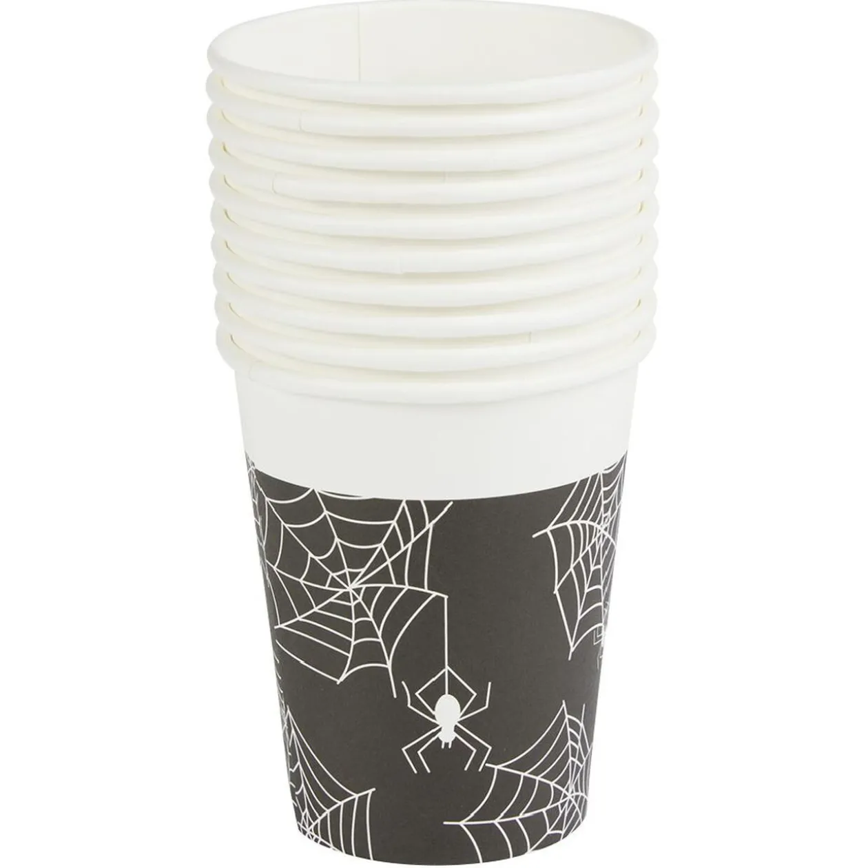 Lot de 10 gobelets en carton noir et blanc à motif araignée, idéal pour fêter Halloween.