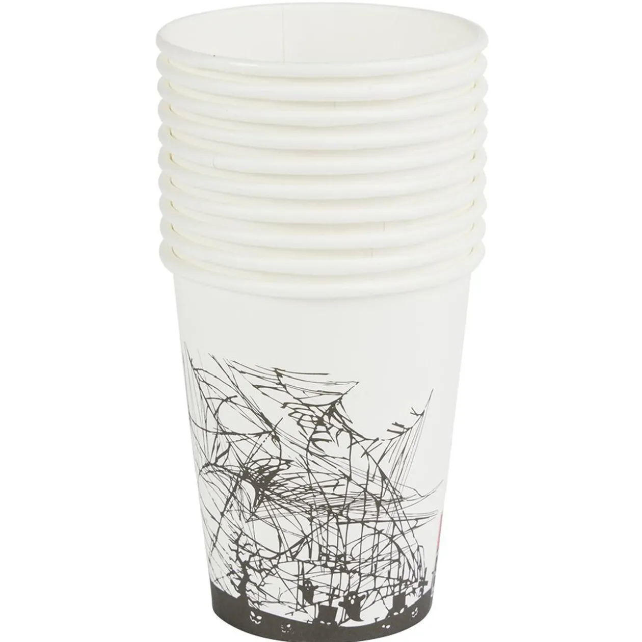 Lot de 10 gobelets en carton noirs et blancs avec inscription « Boo » et motifs toiles d’araignée et fantômes pour fêter Halloween.