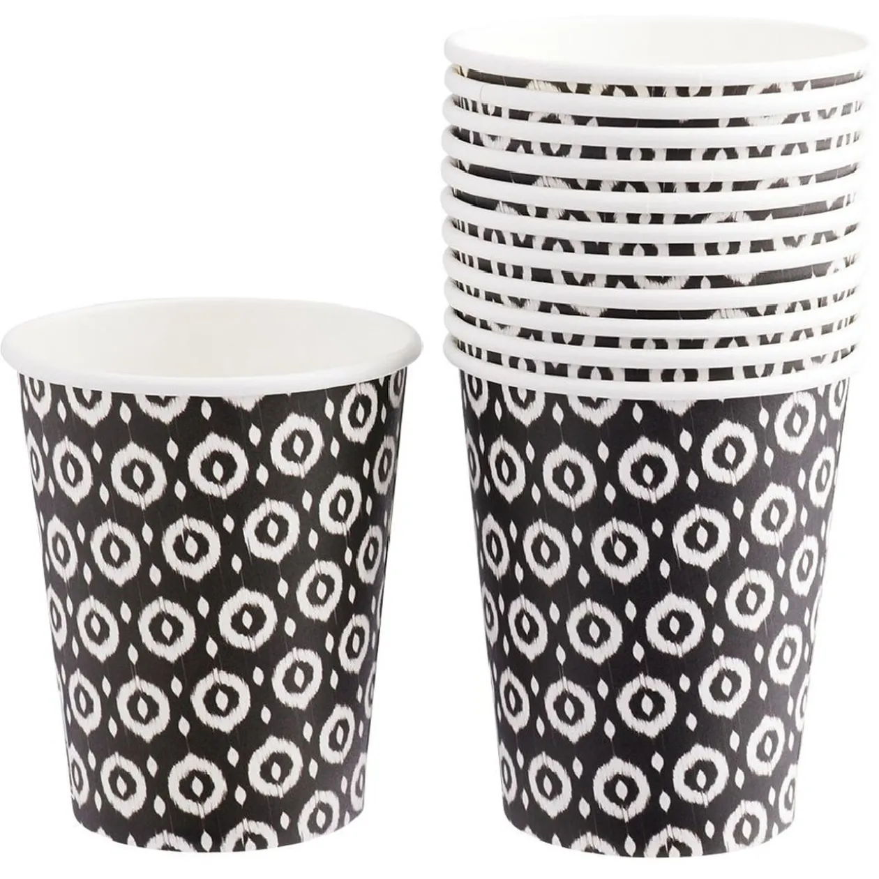 Lot de 12 gobelets jetables en carton imprimé noir et blanc. Élégants et pratiques pour toutes les occasions!