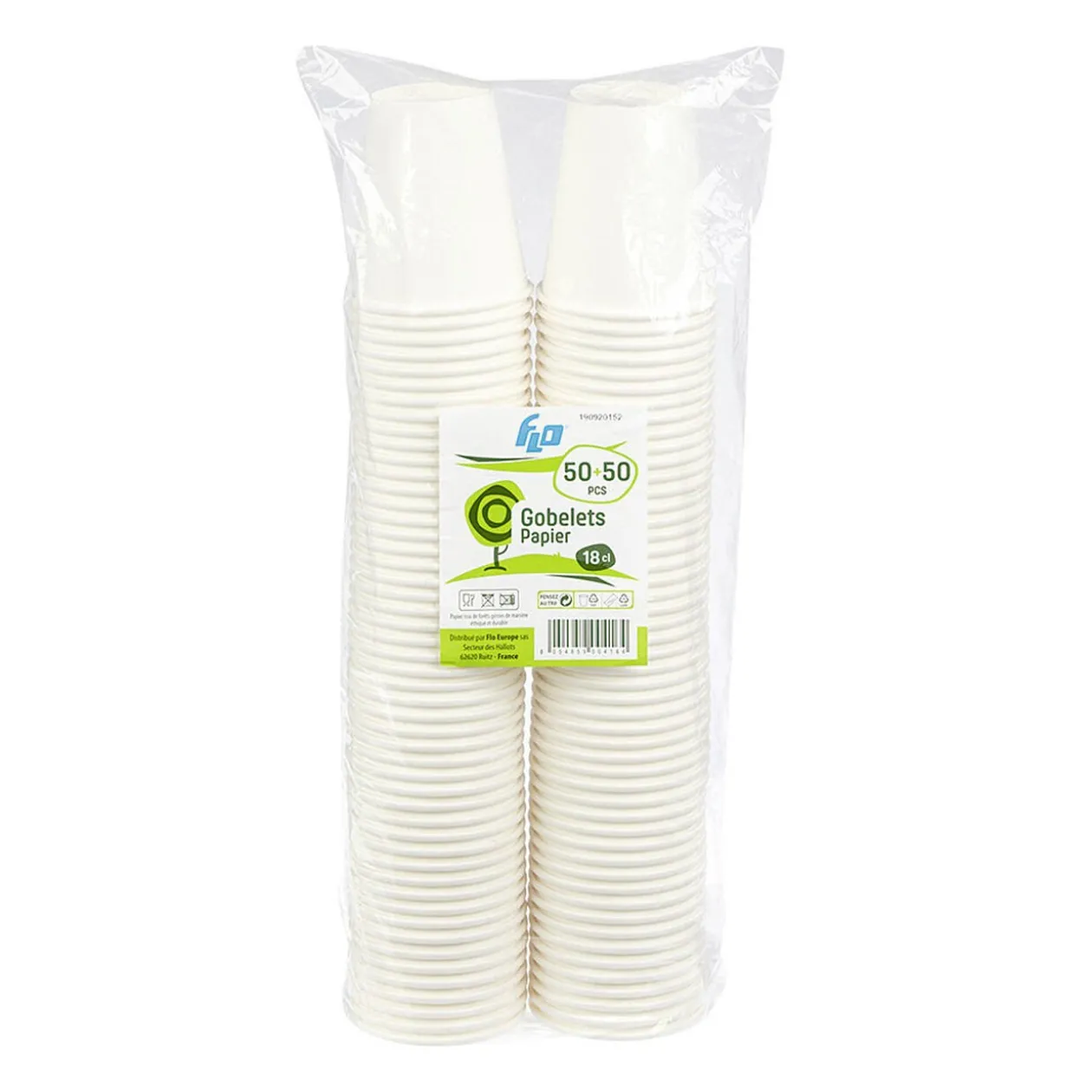 Lot de 100 gobelets unis blancs d’une contenance de 18 cl.