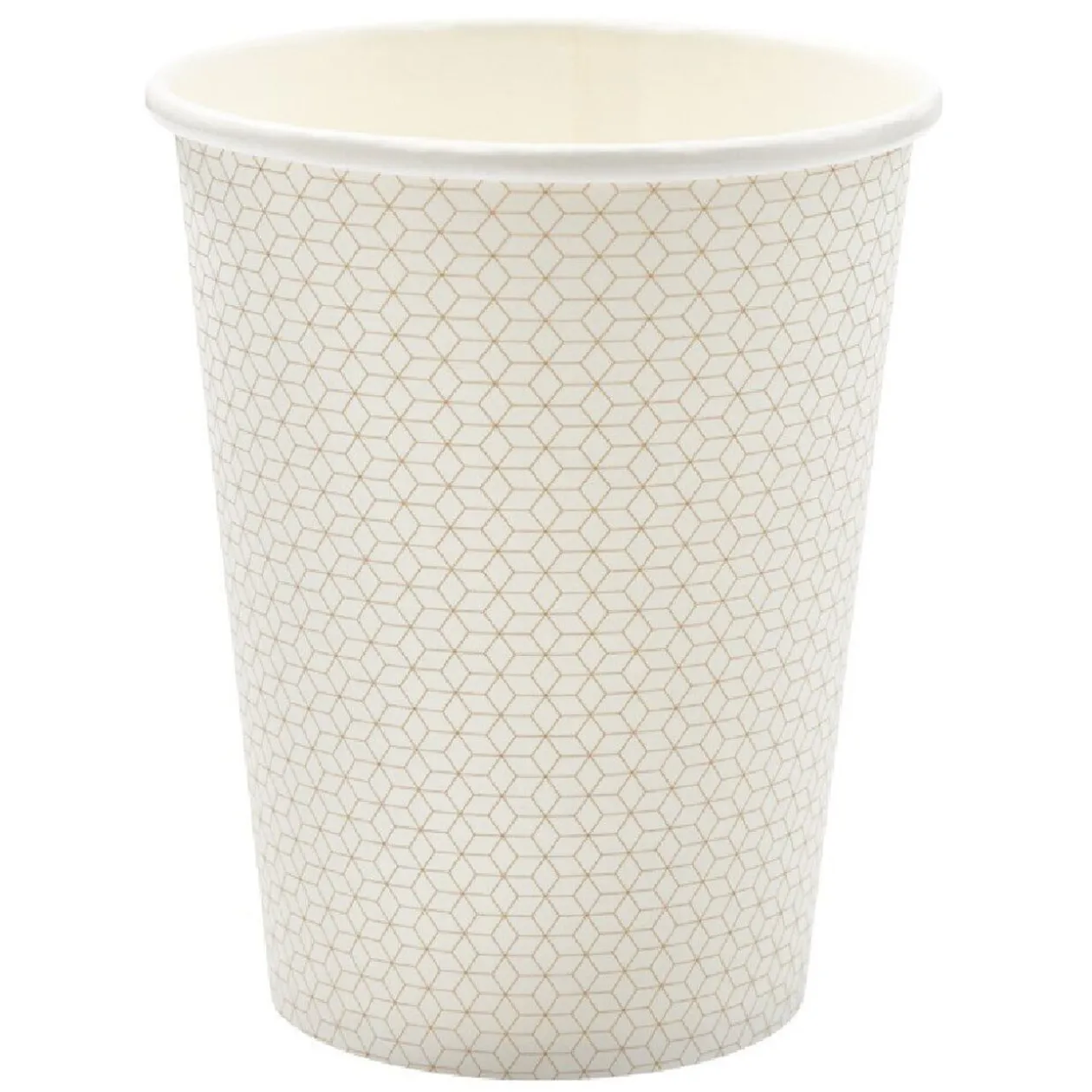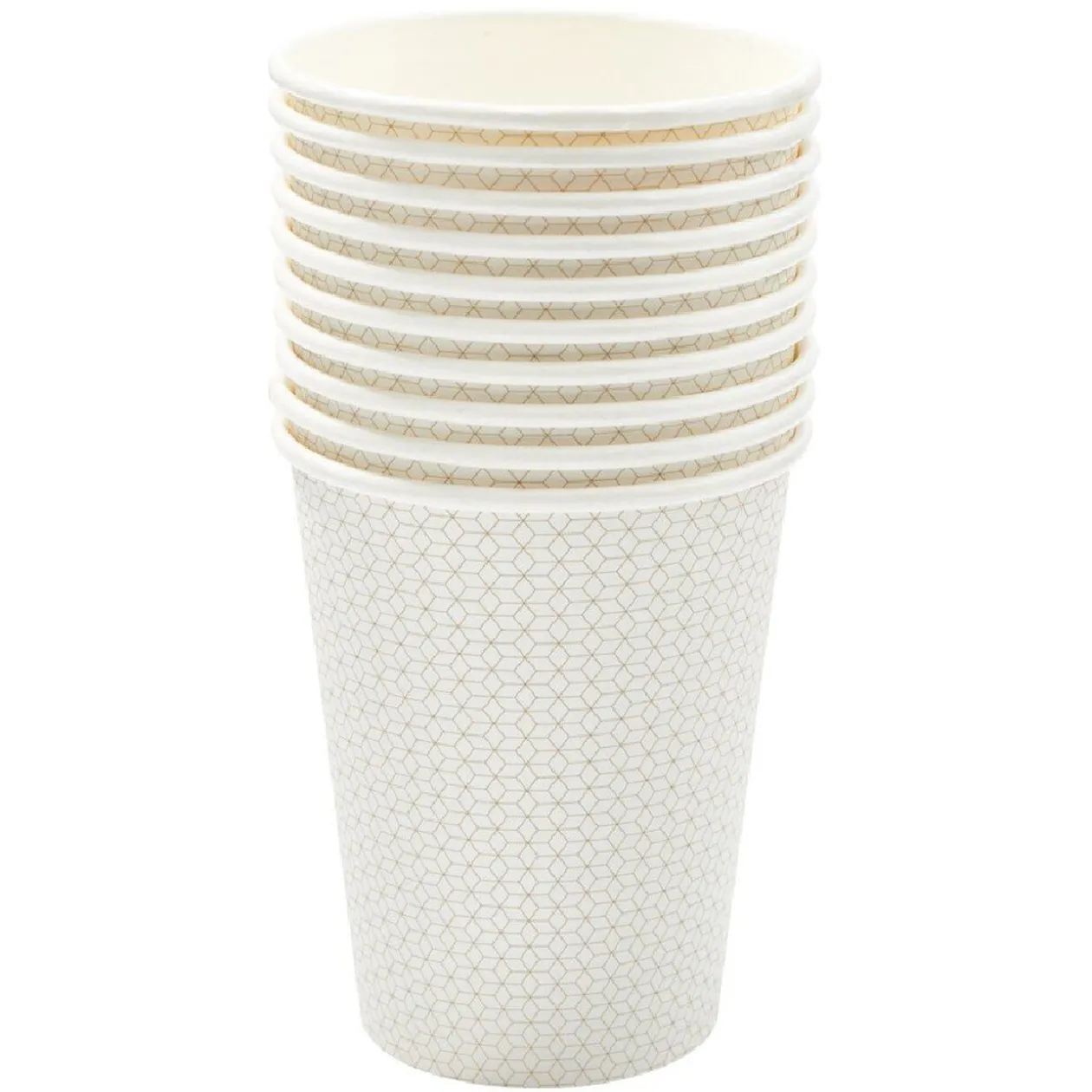 Lot de 10 gobelets jetables blancs avec motifs géométriques triangulaires gris, d’une contenance de 25 cl. N’hésitez pas à compléter votre table avec les assiettes jetables assorties, réf. 506067 !