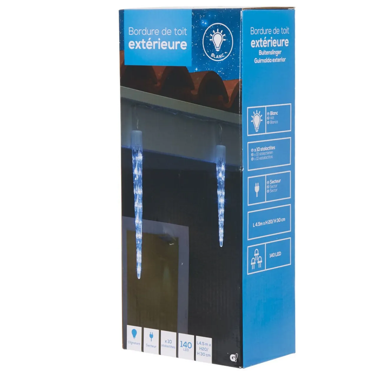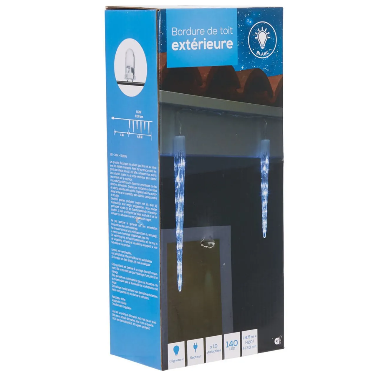 Givrez vos illuminations de Noël en accrochant cette guirlande lumineuse de 10 stalactites. D’une longueur de 450 cm, elle pourra facilement créer un rideau de glace de 100 led pendant à votre toit et habillera votre maison d’une lumière accueillante.