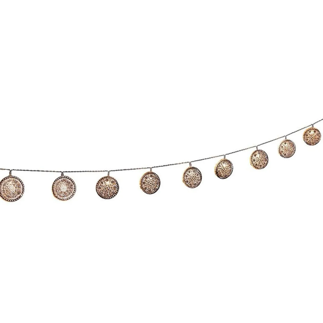 Cette Guirlande électrique en métal rosé est composée de 10 boules plates design flocons et éclairées par des led blanches chaudes.