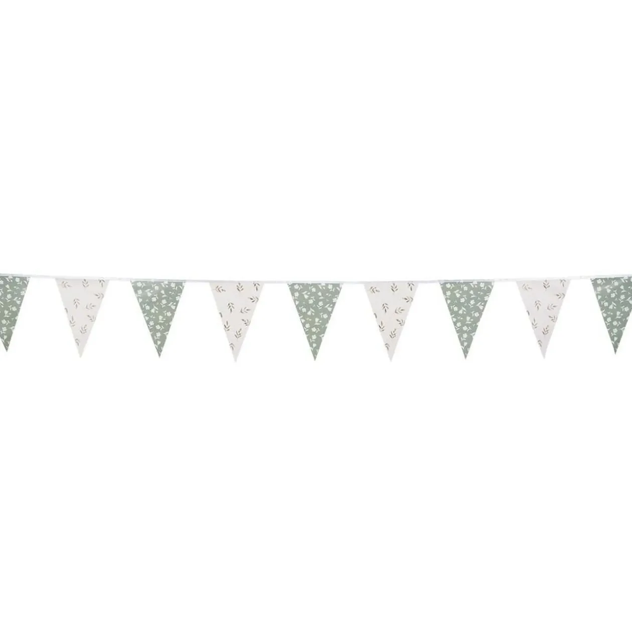 Composée de fanions vert sauge à motif floral et de fanions beiges à motifs feuillages, cette guirlande qui inspire la tendresse apportera une note bohème à votre décoration.