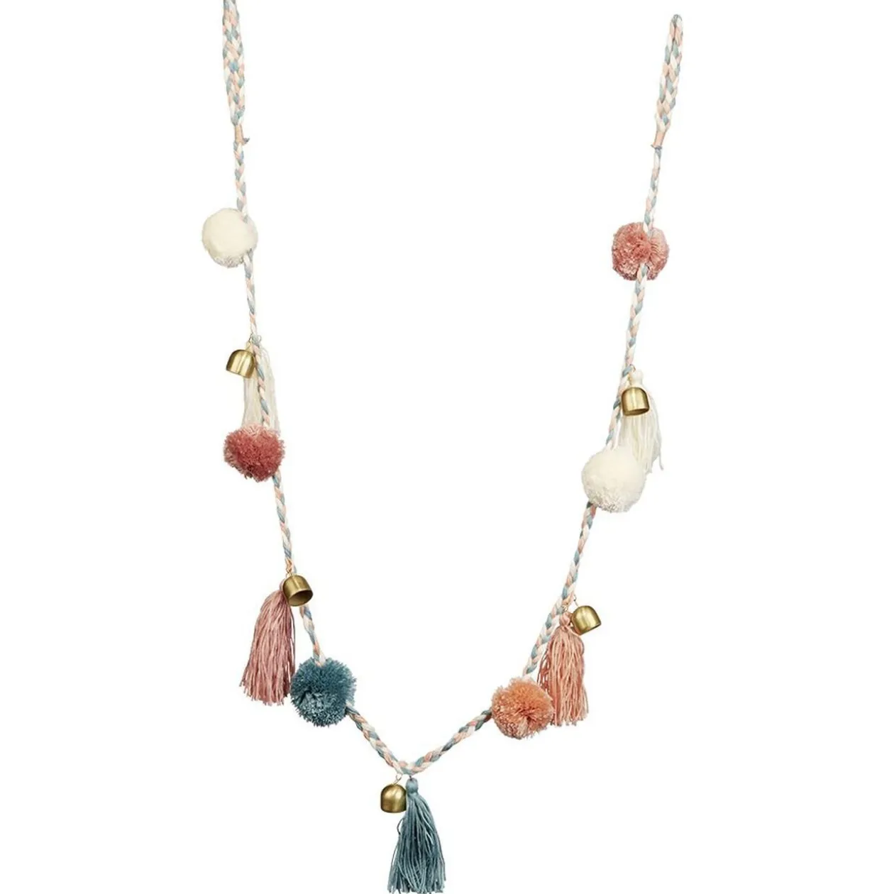 Guirlande fantaisie composée de pompons blancs, roses et verts et de clochettes en métal doré, idéale pour venir compléter une décoration d’intérieur de style bohème.