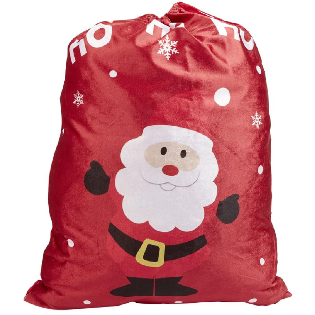 Hotte de Noël rouge en velours avec motif Père Noël pour déposer les cadeaux sous le sapin le soir du réveillon.