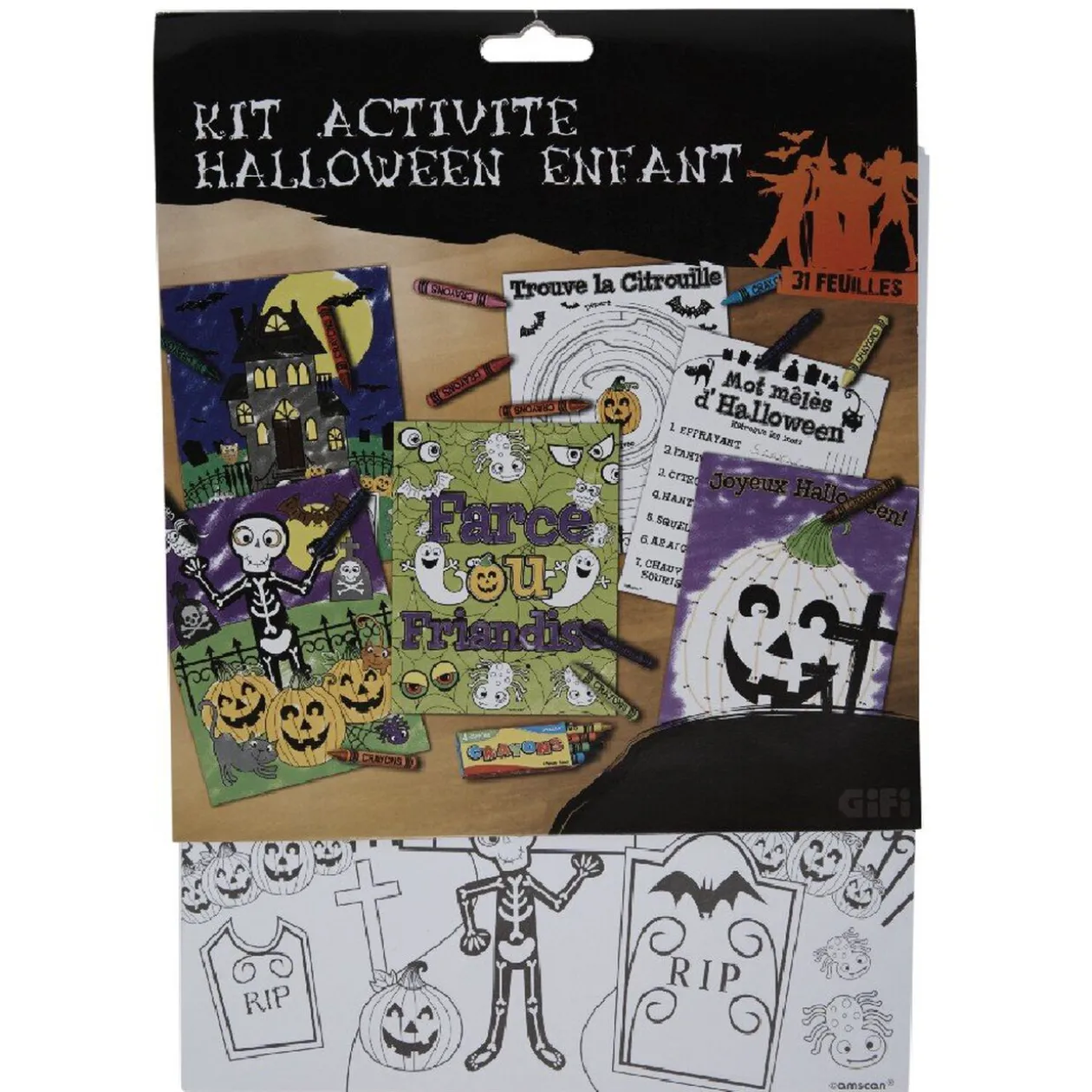 Kit créatif pour enfant composé de 31 feuilles d’activités, de coloriage et jeux sur le thème de Halloween.