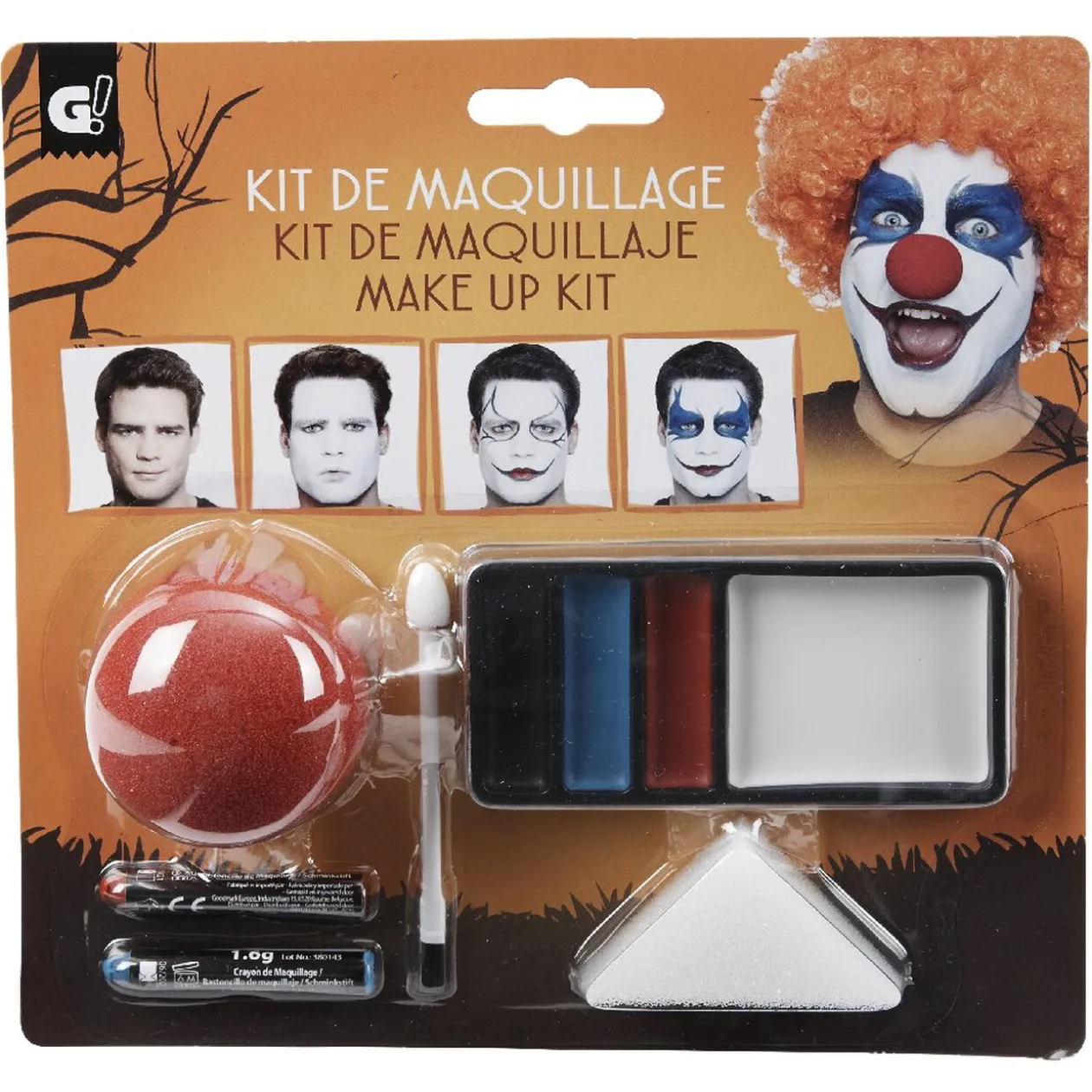 Maquillage blanc, rouge, bleu et noir. Éponge de teint, pinceau, crayon bleu et rouge, nez de clown.