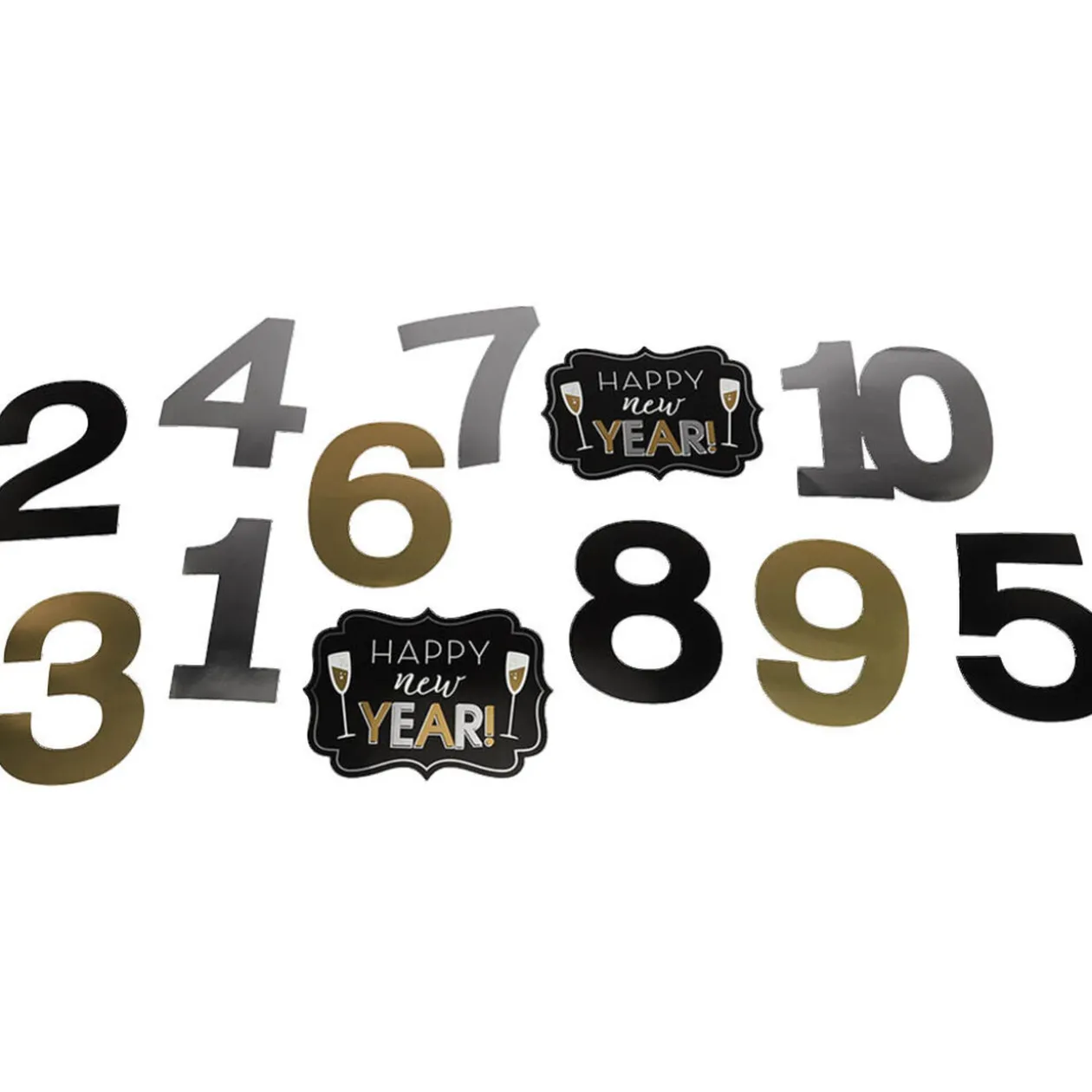 Kit photo booth nouvel an de 12 pièces. Coloris noir et doré. Comprend différentes formes et chiffres pour une fête réussie!