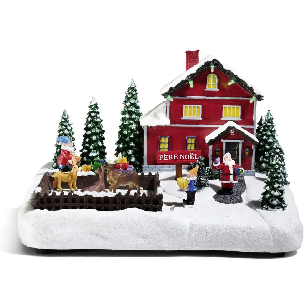 Maison du Père Noël lumineuse avec rennes dans leur enclos et lutins.