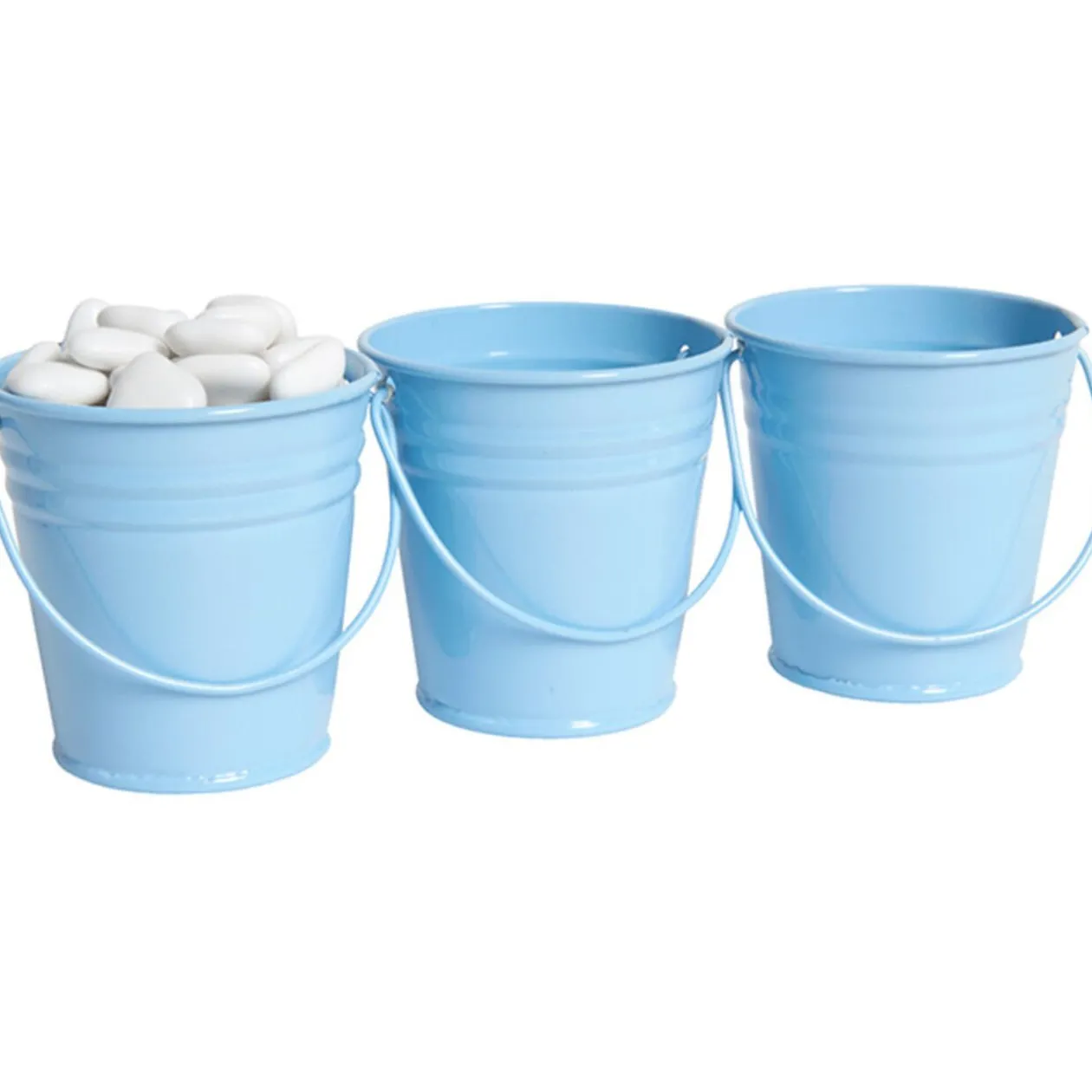 3 minis seaux bleus, dim. Ø6xh.5,5 cm, aluminium. Peut s’utiliser en décoration pour mariage, baptême ou autre évènement. Vendu sans dragées.