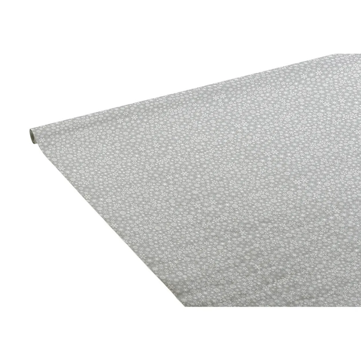 Nappe en papier de couleur argentée décorée de petits flocons blancs.