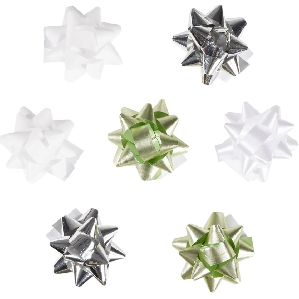 Lot de 8 noeuds en bolduc de couleur vert, blanc et argenté, indispensable pour finaliser vos emballages cadeaux de Noël.
