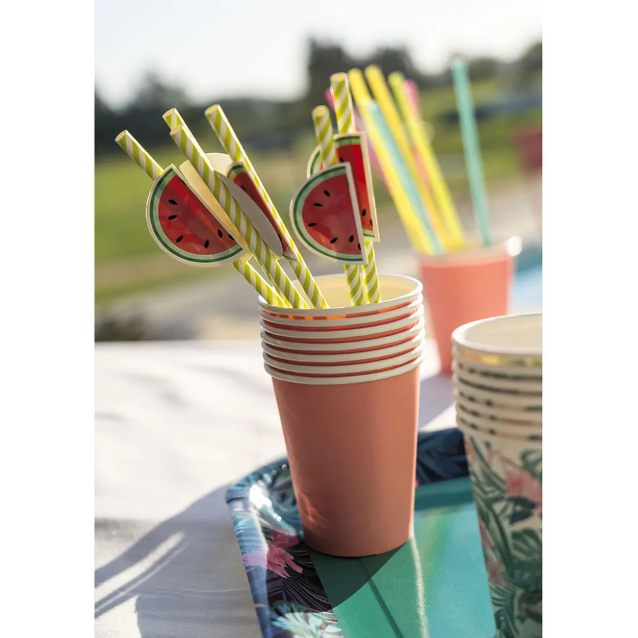 Amusez-vous en buvant un verre grâce à ce lot de 16 pailles en papier de couleur blanche et verte accompagnées d’une pastèque. Pour un moment fun et drôle.
